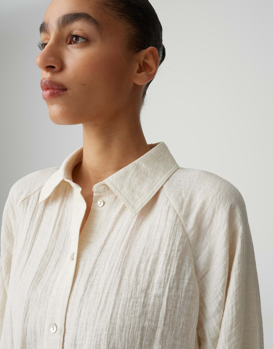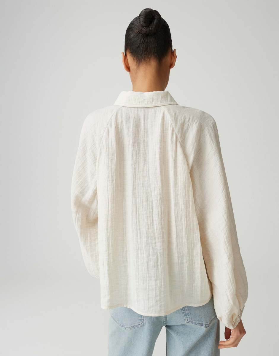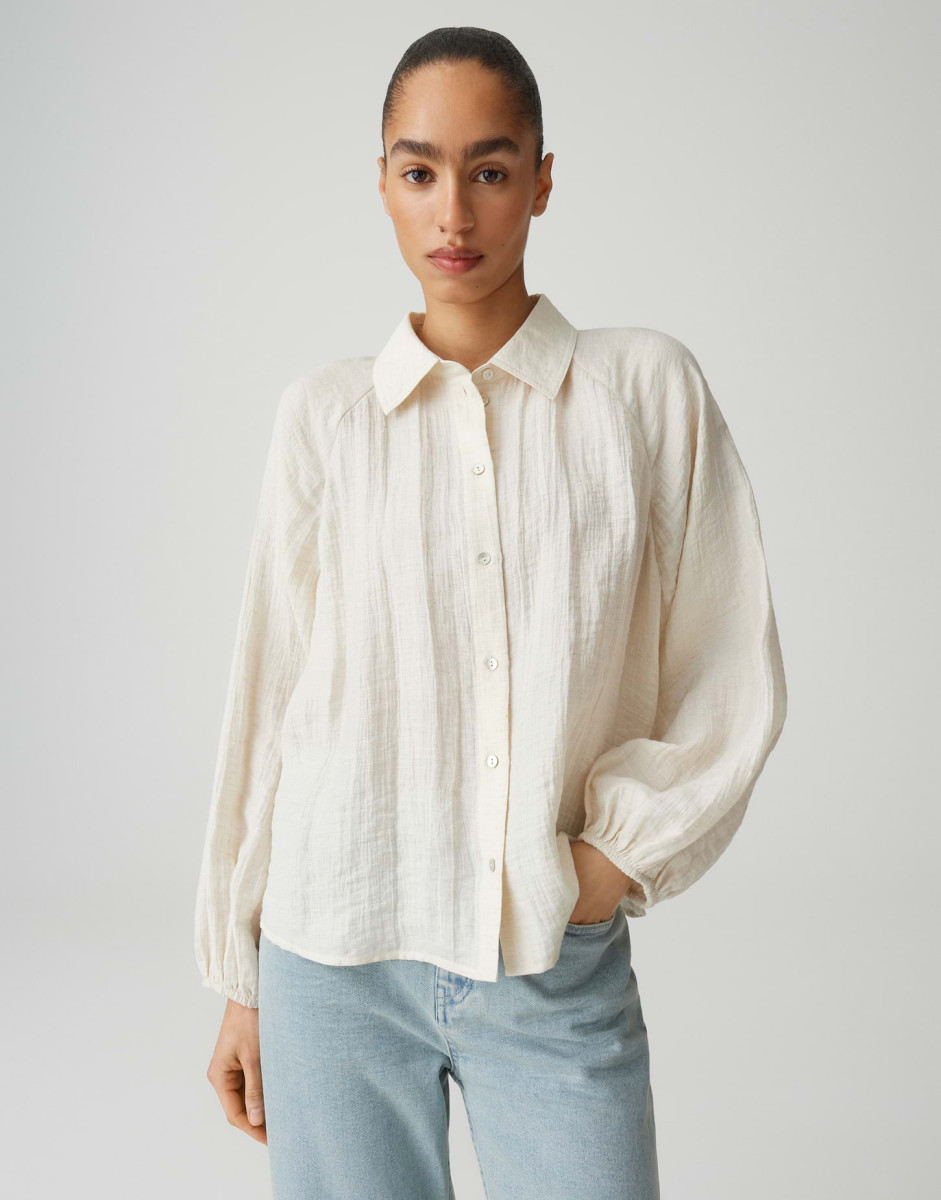 Die Bluse Framatica überzeugt mit einer lockeren Passform und geradem Schnitt sowie einem klassischen Hemdblusenkragen. Die lange Ärmelpartie mit Ballonärmeln, elastischem Gummi am Ärmelsaum und einer Knopfleiste mit Perlmuttknöpfen verleiht dem Modell moderne Details. Mit natürlichem Griff, fließendem Fall und leichter Transparenz ist die Bluse vielseitig kombinierbar.