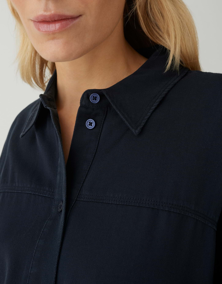 Die Bluse Fynamo hat eine lockere, ovale Passform und einen leicht verkürzten Schnitt, der einen modernen, entspannten Look erzeugt. Mit Hemdblusenkragen, überschnittener Schulter und langen Ärmeln verbindet sie klassische Details mit einer fließenden Silhouette; die dezente Twillstruktur und die authentische Waschung sorgen für eine edle Optik und einen angenehmen Fall. Funktionale Details wie Knopfleiste, vorn angesetzte Passe, Teilungsnähte im Rücken und ein geraffter Ballon-Saum machen die Bluse vielseitig kombinierbar.Lief.-Art-Nr: 1051659114106