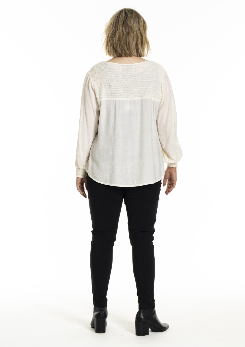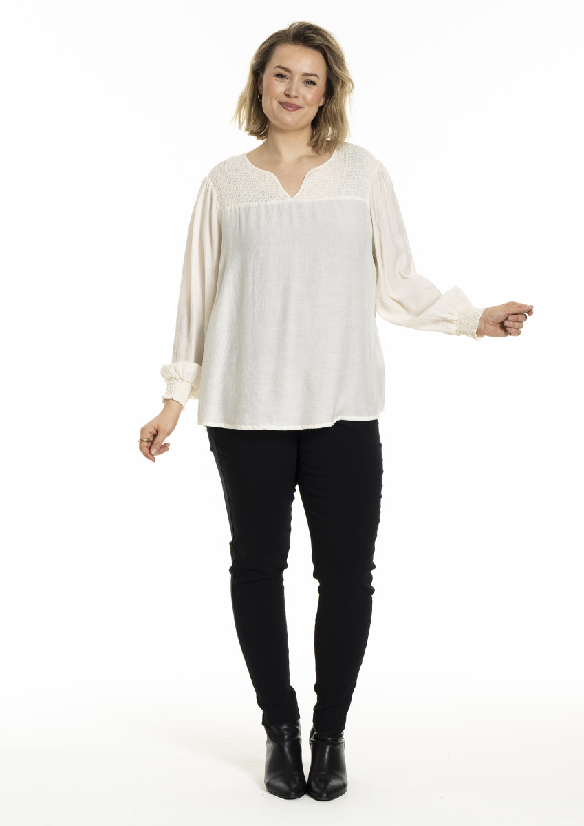 V-Ausschnitt mit schlichter Kante | Lange Ärmel mit elastischen Manschetten | Lockerer Schnitt mit leichtem Fall | Das Material ist leicht und atmungsaktiv mit einer weichen Struktur, die natürlich fällt