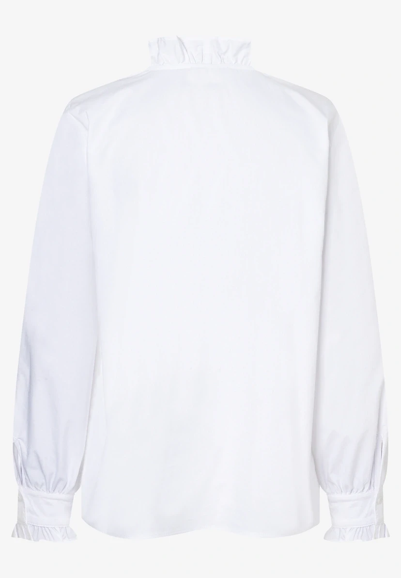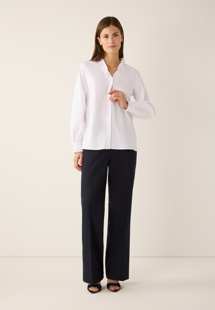 Gerade Form | Verdeckte Knopfleiste | V-Ausschnitt mit Rüsche | Lange Ärmel mit geknöpften Manschetten und Rüschenkante | Angenehm elastisch