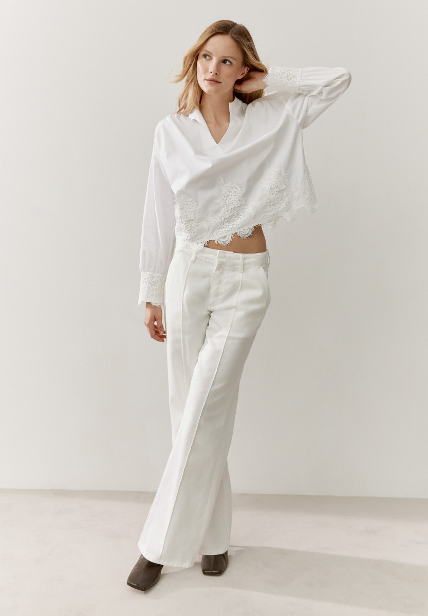 Diese weiße Bluse von MORE & MORE mit tonigem Spitzenbesatz am unteren Saum und an den Ärmelmanschetten ist ein stilvolles Statement-Piece, das zeitlos und zugleich modern ist. Stylen Sie die verkürzte Bluse mit Röcken, Jeans oder klassischen Businesshosen zu einem neuen Trend-Look.Lief.-Art-Nr: 61022007