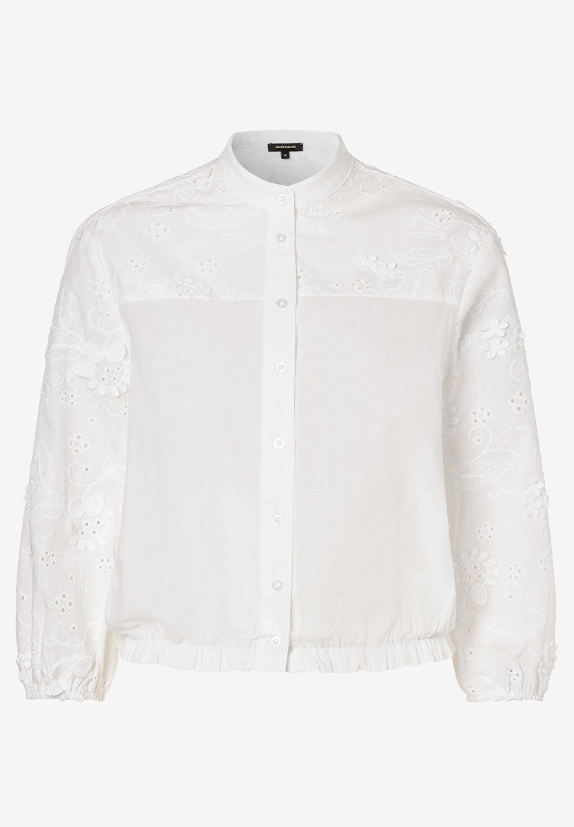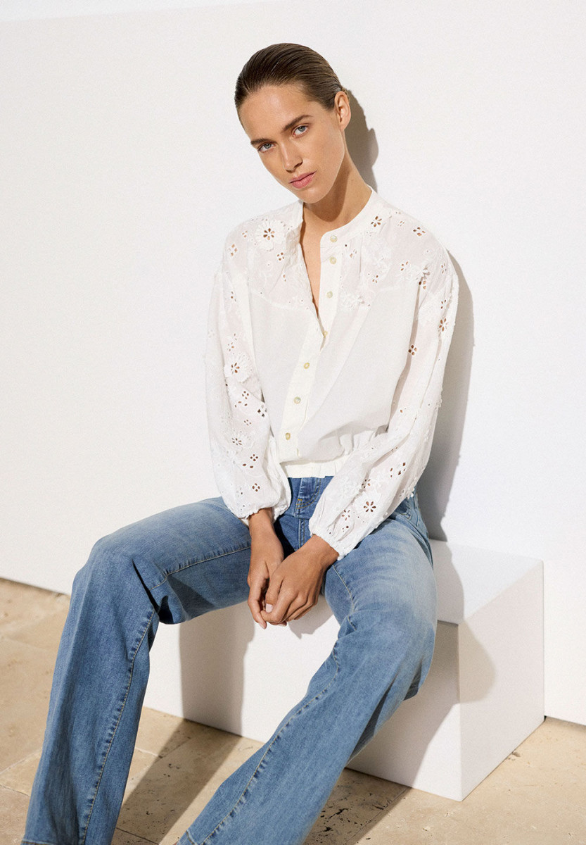 Lockere Passform | Durchgehende Knopfleiste | Kleiner Stehkragen | 3/4 lange Ärmel mit Gummizug an den Enden | Gummizug am unteren Saum | Florales Stickmuster