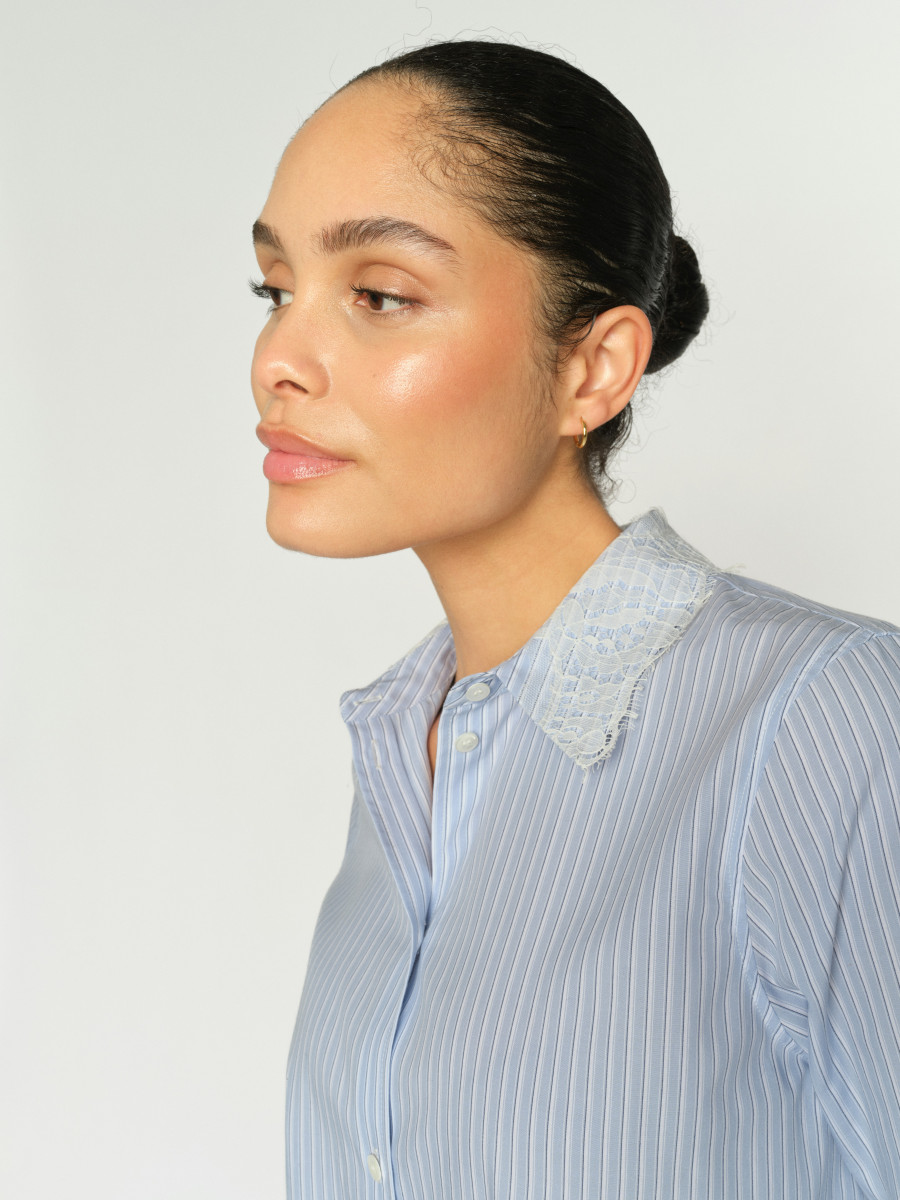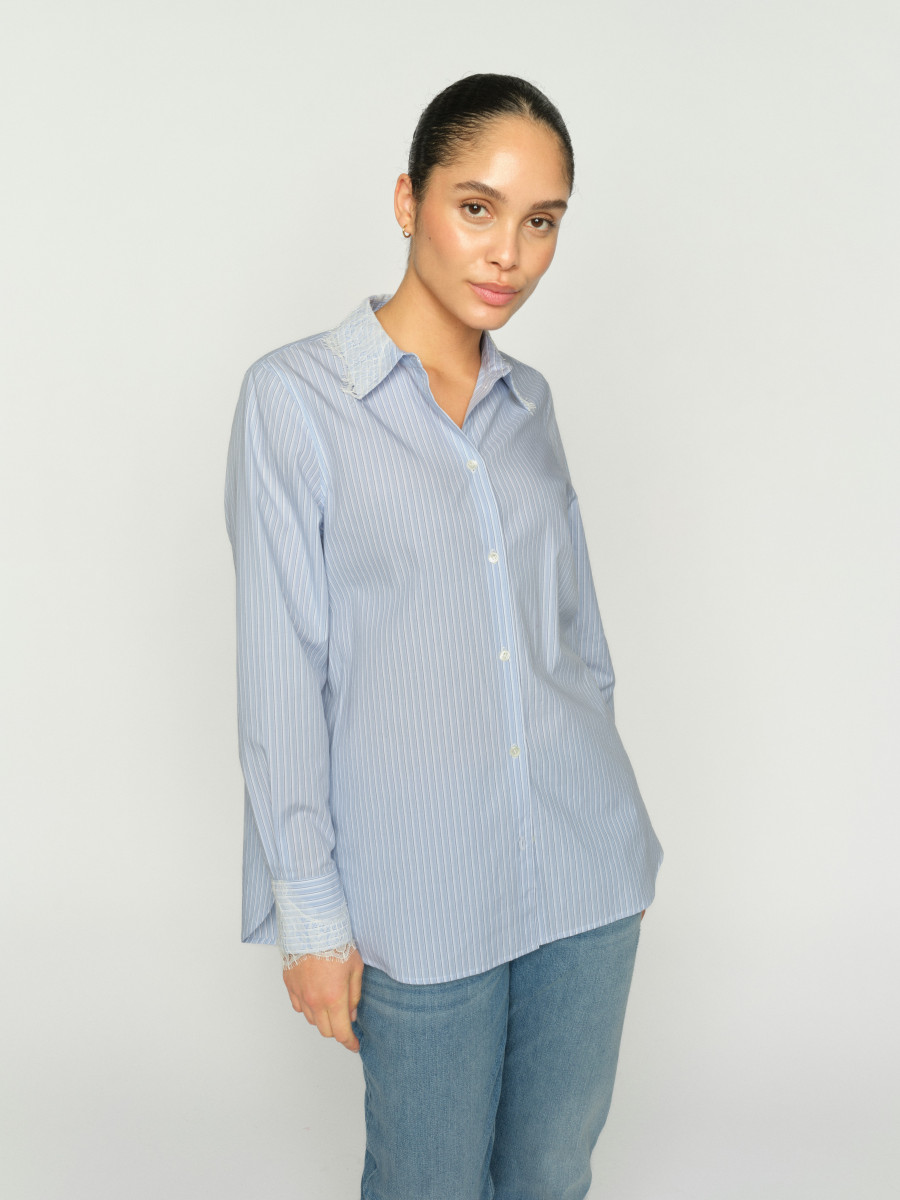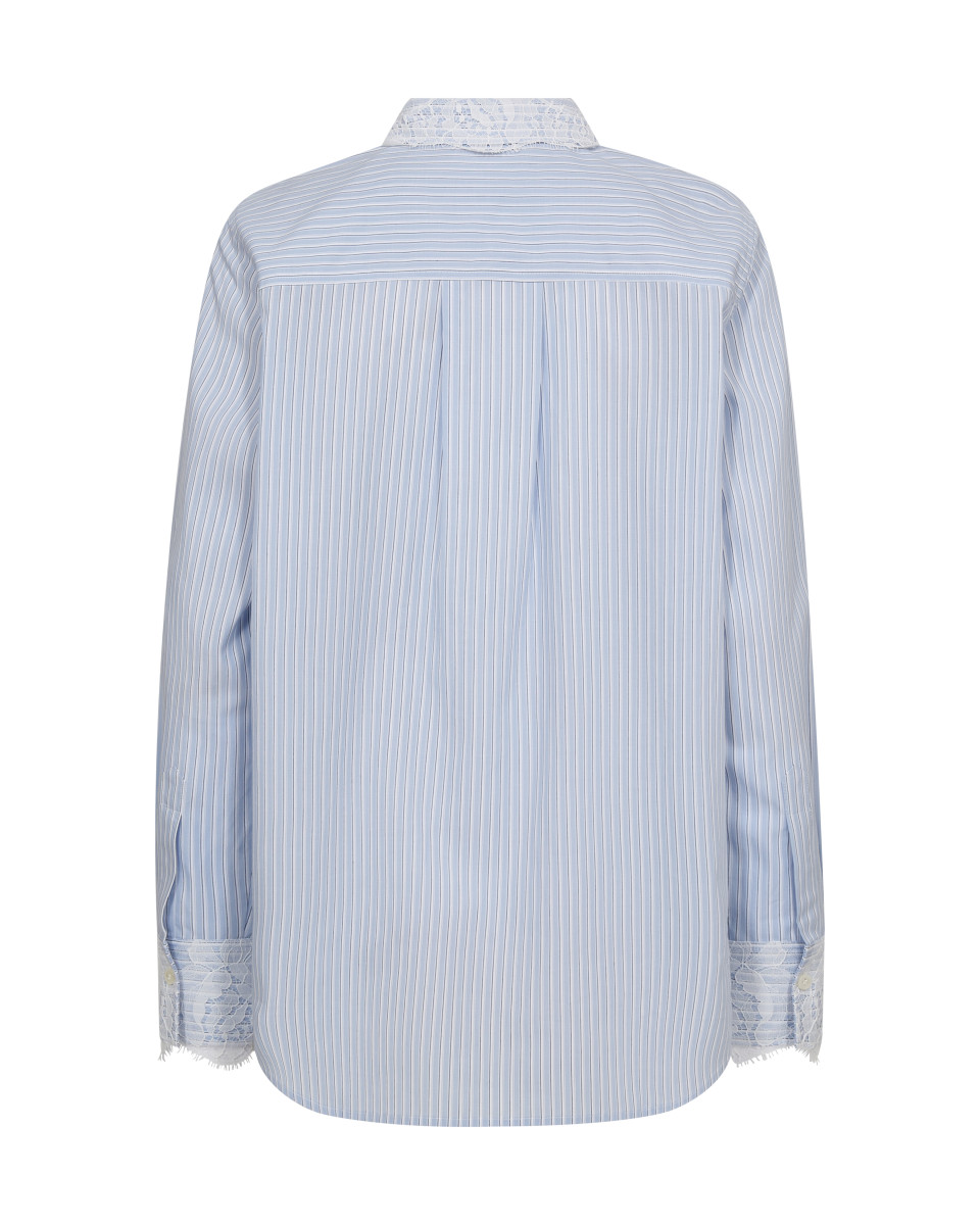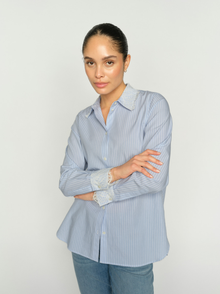 Die Bluse MMElinda besticht durch eine feminine Silhouette mit zarten Spitzen- und Streifendetails, die dem Modell eine elegante Note verleihen. Sie lässt sich vielseitig kombinieren und eignet sich sowohl für den Alltag als auch fürs Büro. Ein leichter Fall und angenehmer Tragekomfort runden das Design ab.