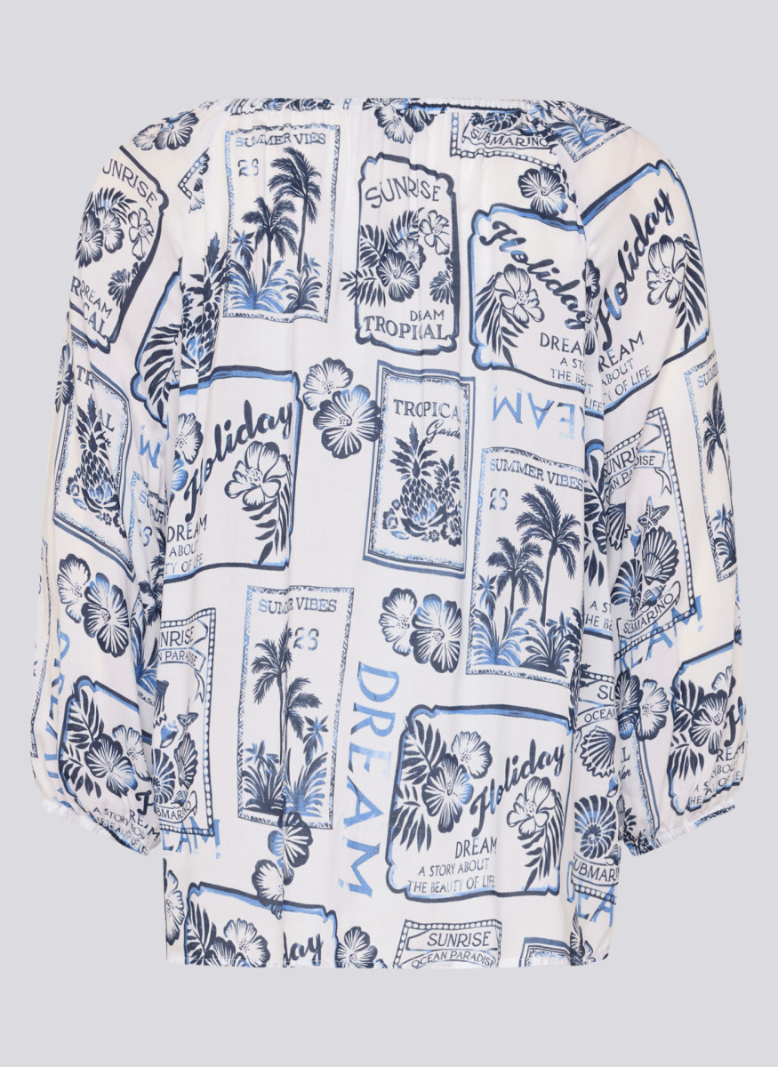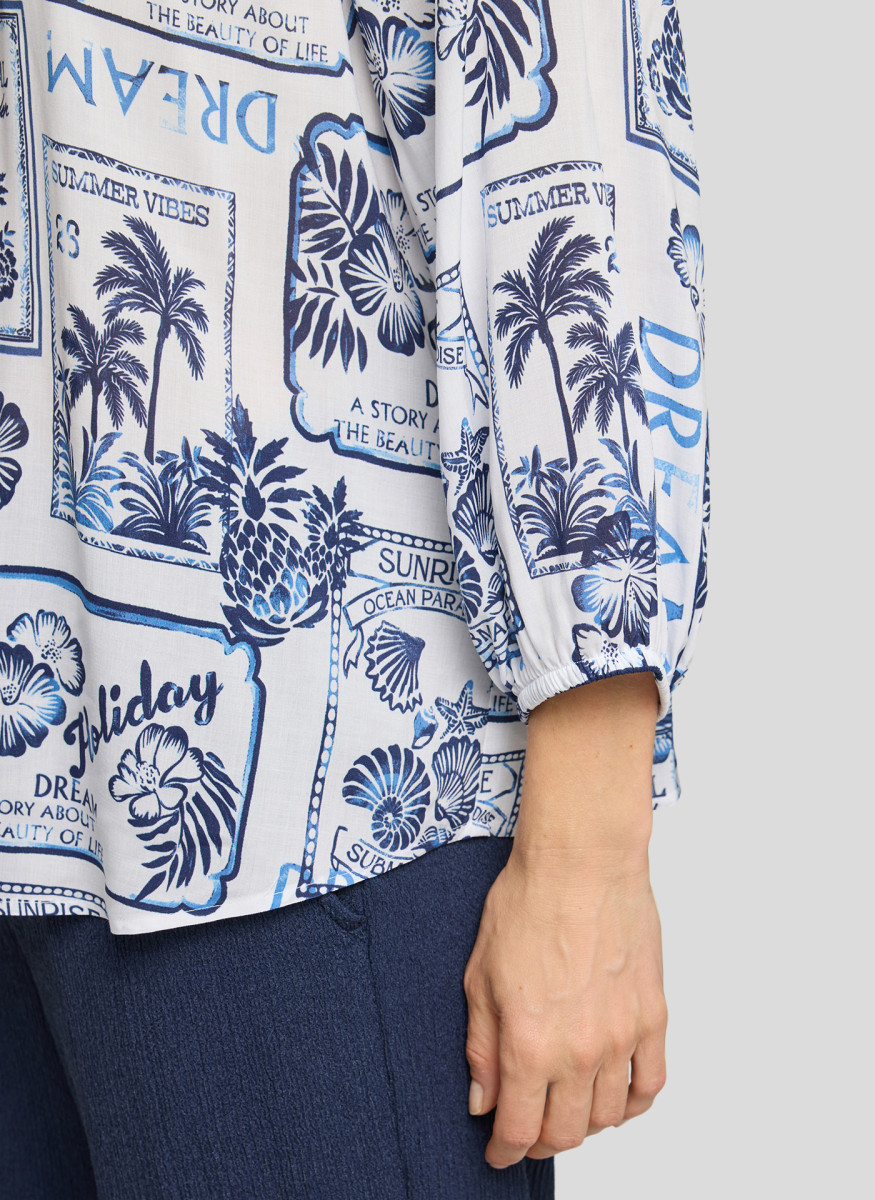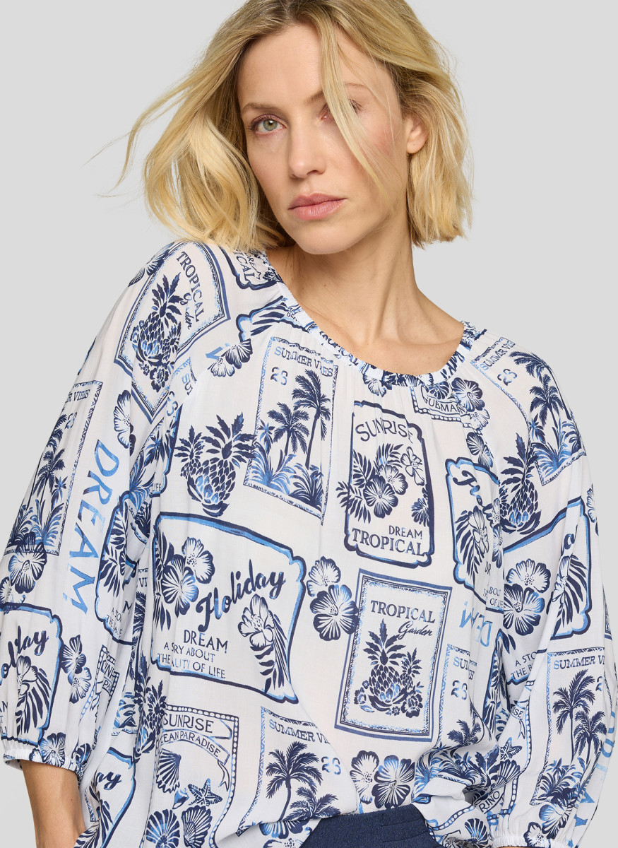 Die leichte Viskose verleiht dieser Bluse eine weich fließende Qualität und ein angenehmes Tragegefühl. Der Rundhalsausschnitt mit kleinem Schlitz setzt einen dezenten Akzent, während die lockere Passform für eine entspannte Silhouette sorgt. Die 3/4-Ärmel enden mit elastischen Bündchen und fallen leicht bauschig, was den luftigen Charakter unterstreicht. Der ausdrucksstarke Allover-Print macht das Modell zu einem vielseitigen Blickfang für Alltag und Freizeit. Reine Viskose mit weichem Fall. Locker geschnittene Form. Rundhalsausschnitt mit Schlitz. 3/4-Ärmel mit elastischem Abschluss. Luftig und angenehm zu tragen.Lief.-Art-Nr: 56-121109