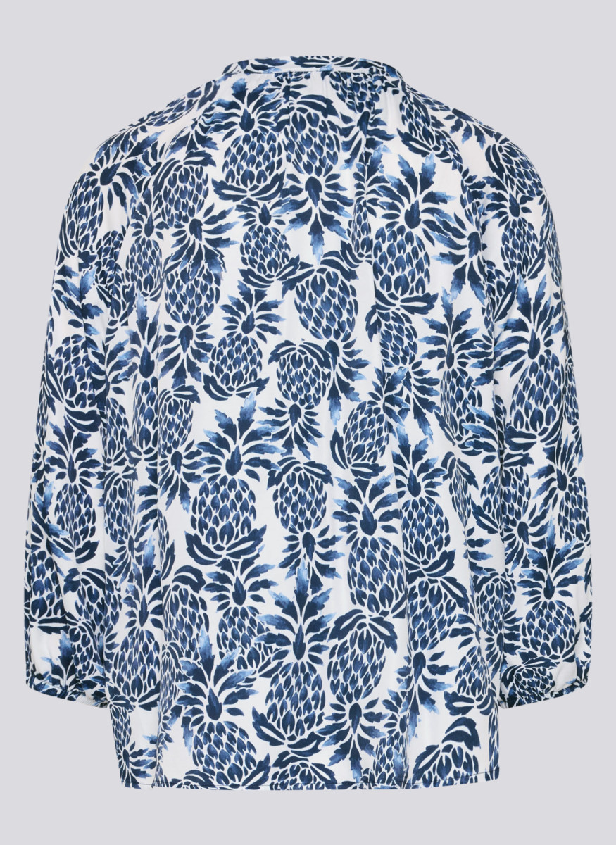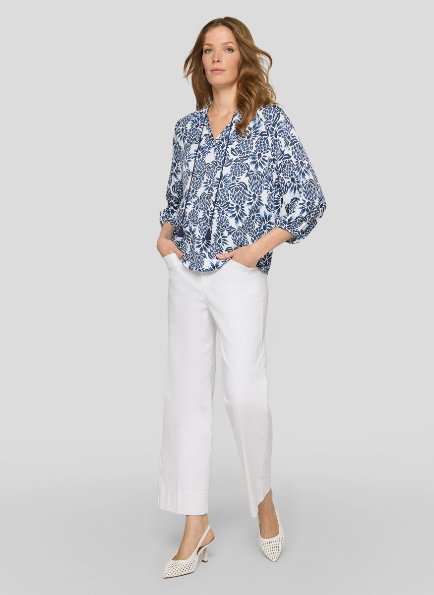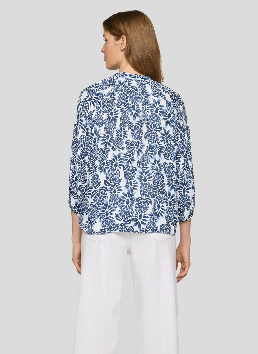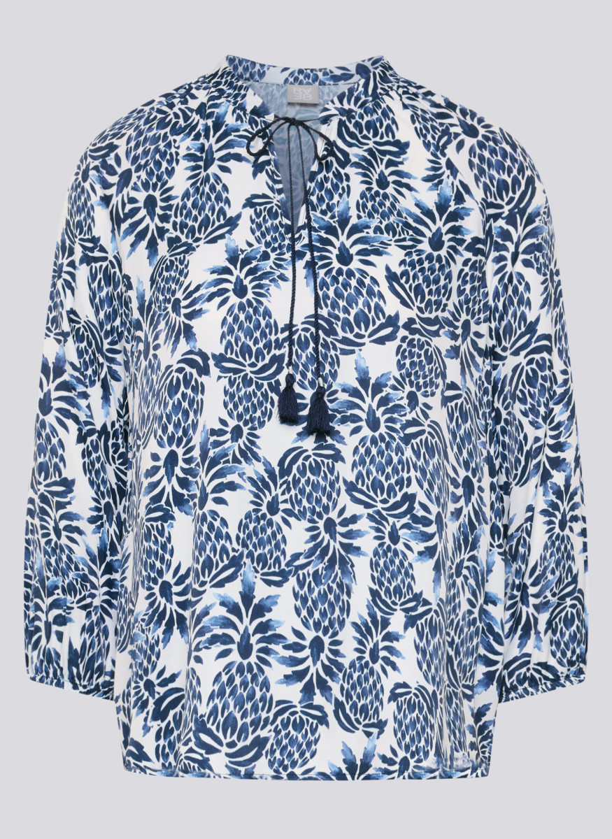 Die weich fließende Viskose verleiht dieser Bluse eine luftige, angenehme Qualität und sorgt für hohen Tragekomfort. Der kleine Stehkragen mit Schlitz und dekorativem Bindeband unterstreicht den femininen Charakter, während die lockere Passform eine entspannte Silhouette schafft. Die 3/4-Ärmel enden mit elastischen Bündchen und fallen leicht bauschig, was den legeren Stil zusätzlich betont. Ideal für vielseitige Kombinationen – von casual bis gepflegt.Lief.-Art-Nr: 56-121103