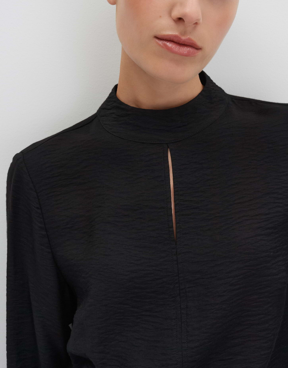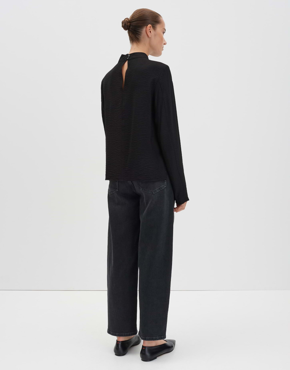Dieses modische Langarm-Oberteil bietet eine weite Passform und einen geraden Schnitt, der für eine entspannte Silhouette sorgt. Der Stehkragen verleiht dem Design einen eleganten Touch, während die dezente Struktur des Stoffes für eine angenehme Haptik sorgt. Der leichte Stoff und die leichte Transparenz machen dieses Oberteil zu einem idealen Begleiter für die Übergangszeit oder das Layering mit anderen Kleidungsstücken.