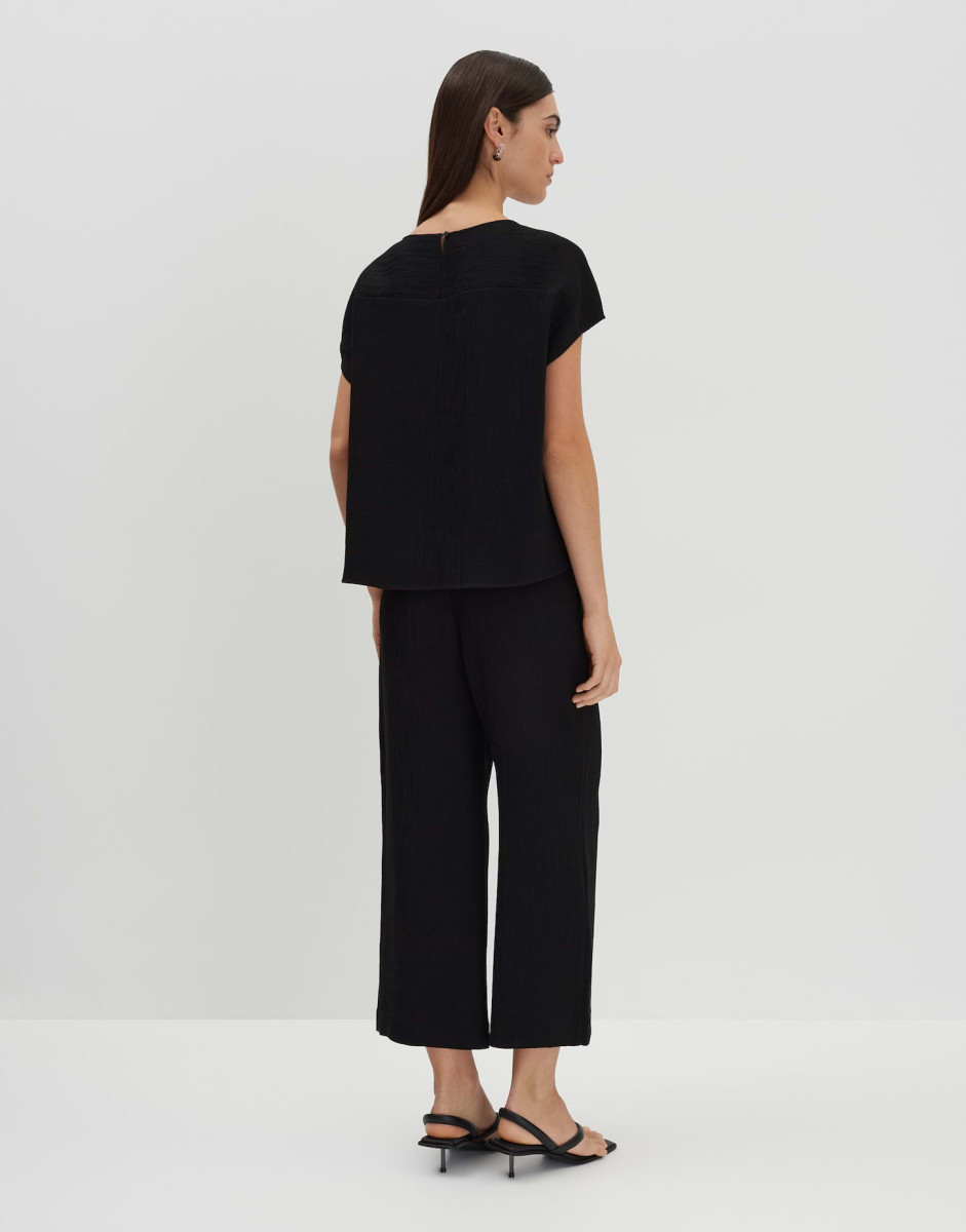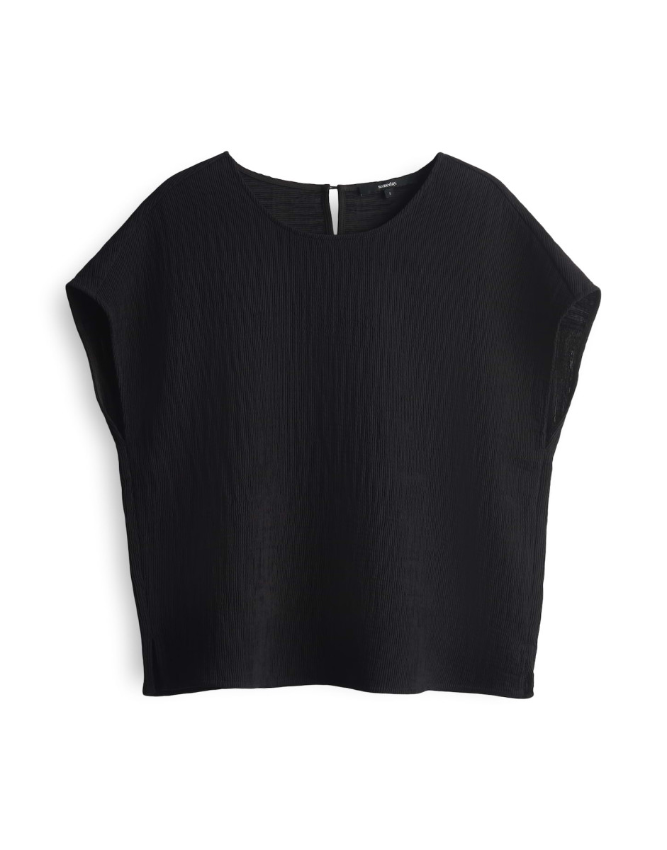 Lockere Passform | Gerader Schnitt | Überschnittener Kurzarm | Rundhalsausschnitt | Rückenlänge ca. 58 cm bei Größe S | Model Größe 176 cm – trägt Größe S | Webware | Crinkle Effekt | Fester Griff | Fließender Fall | Elastischer Stoff | Knopf mit Öse im Rücken | Passe im Rücken