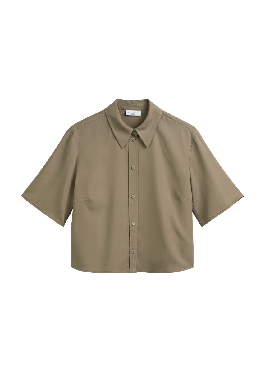Perfekt als Solo-Piece oder in Kombination mit T-Shirt oder Kleid im Layering-Stil: die superlässige Crop-Bluse mit klassischem Kentkragen. Kurzer, leicht kastiger Schnitt mit dezent überschnittenen Schultern, breiter Knopfleiste mit farblich abgestimmten Knöpfen, Brustabnähern und kurzen Ärmeln. Die Qualität: reines, hochwertiges Lyocell mit lässiger, unregelmäßiger Oberfläche.