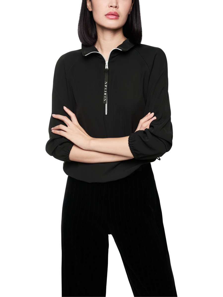 Blusenshirt mit Zipper und Tunnelzug | Unifarbenes Blusenshirt mit Raglanärmeln und sportiven Details. Der Zipper am Ausschnitt wird durch eine auffällige Zuglasche betont. Ärmelbündchen und Saum sind mit Gummizug versehen, der Saum zusätzlich mit Tunnelzug und Kordelstopper. Die lockere Passform sorgt für hohen Tragekomfort. Lockerer Schnitt | Seitliche Eingriffstaschen | Stehkragen mit Zipper | Weich fließend | Das Model ist 179 cm groß und trägt N3/38.