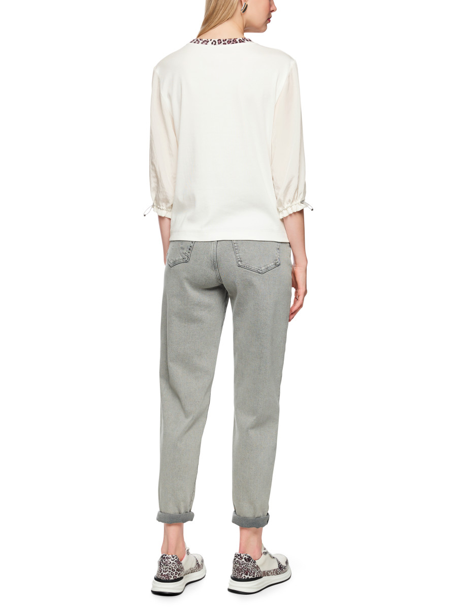 Blusenshirt mit Leo Print | Dieses Blusenshirt kommt im angesagten Materialmix und besticht durch den besonderen Print. Die Form ist locker geschnitten und die Ärmel sind in 3/4-Länge designt. Den Rundhals und die Vorderseite des Shirts ziert ein Leo Print. Die Ärmel sind im Kontrast zum Rest des Shirts aus einem fließenden Material mit abschließendem Gummizug versehen. Lockere Form | Materialmix | Rundhals | Leo Aufdruck | Das Model ist 179 cm groß und trägt N3/38.