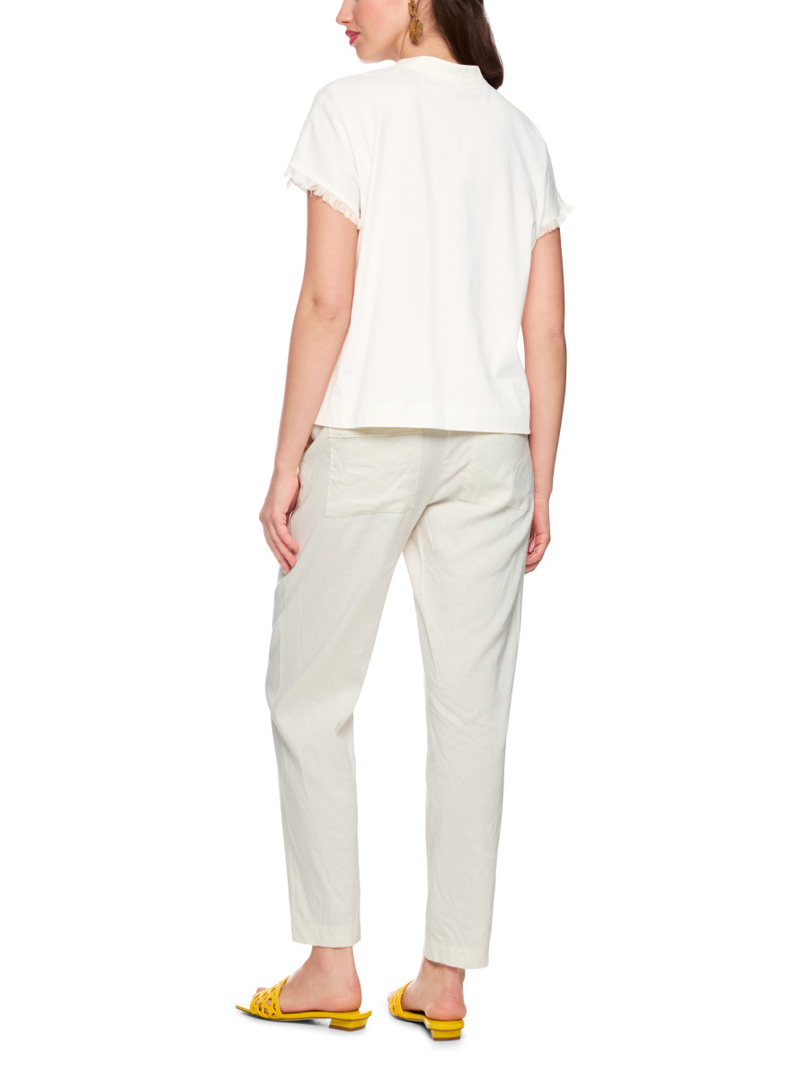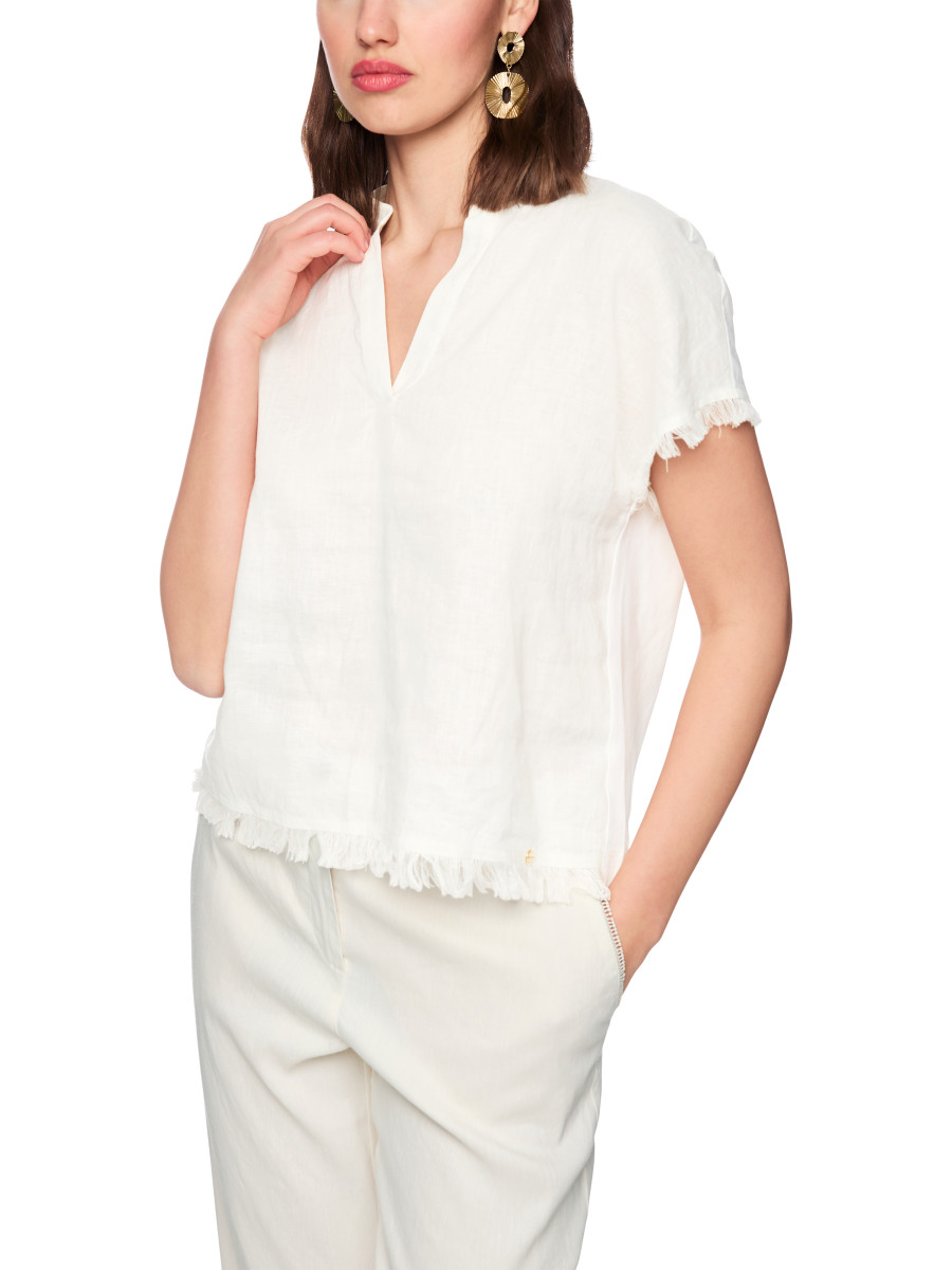 Locker geschnittenes Blusenshirt mit femininem V‑Ausschnitt und angeschnittenen Kurzärmeln. Vorne wird Leinen verwendet, hinten weiche Baumwolle; eine kleine Blende am Kragen sowie dekorative Fransen an Ärmelabschlüssen und Saum setzen elegante Akzente. Der sommerliche Stil lässt sich vielseitig kombinieren und sorgt für eine lässig-geschmackvolle Ausstrahlung.Lief.-Art-Nr: AC 55.06 J79