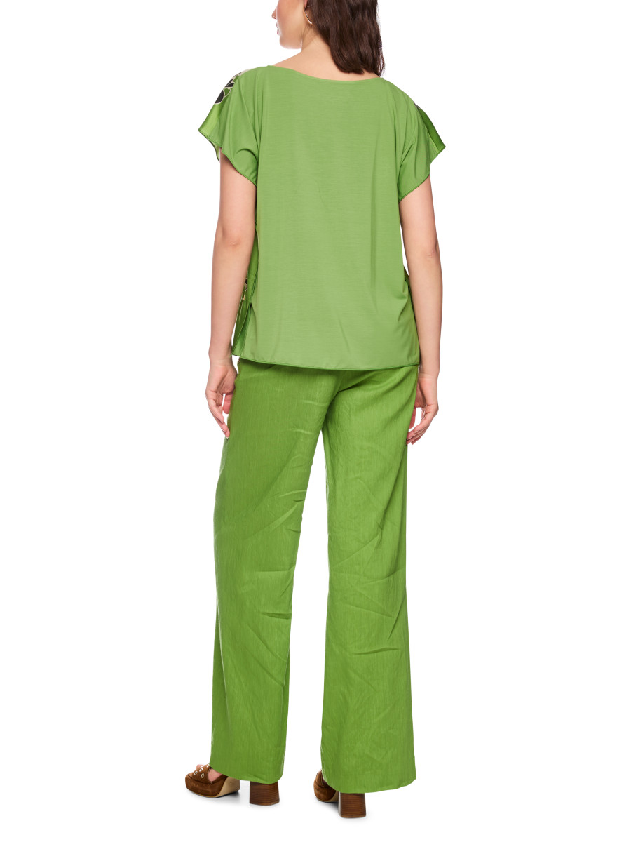 Dieses locker geschnittene Blusenshirt überzeugt mit einem eleganten U-Boot-Ausschnitt und kurzen, angeschnittenen Ärmeln, die dem Modell eine moderne Silhouette verleihen. Die Vorderseite zeigt einen Panneaux-Print mit stilisierten Hibiskusblüten und verleiht dem Shirt eine besondere, sommerliche Note. Die Vorderseite besteht aus Seide, die Rückseite aus Modal mit Elastan, was für angenehmen Tragekomfort sorgt.Lief.-Art-Nr: AC 55.24 J56