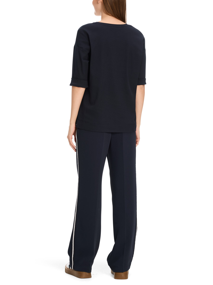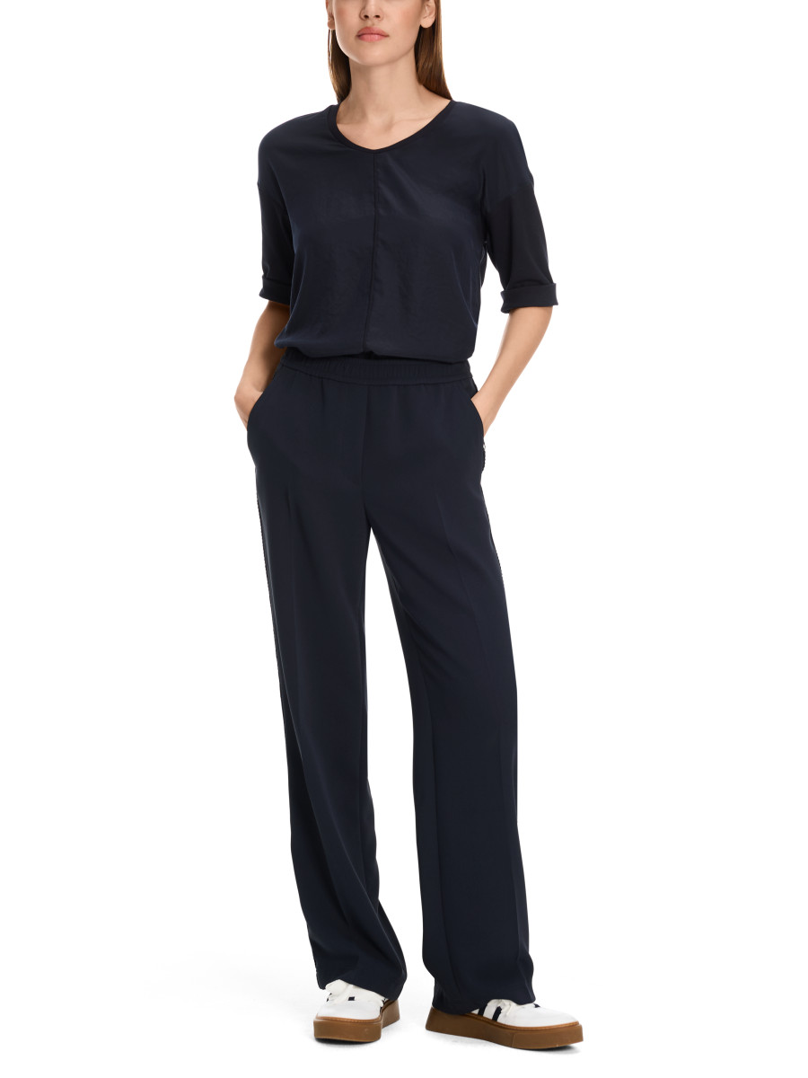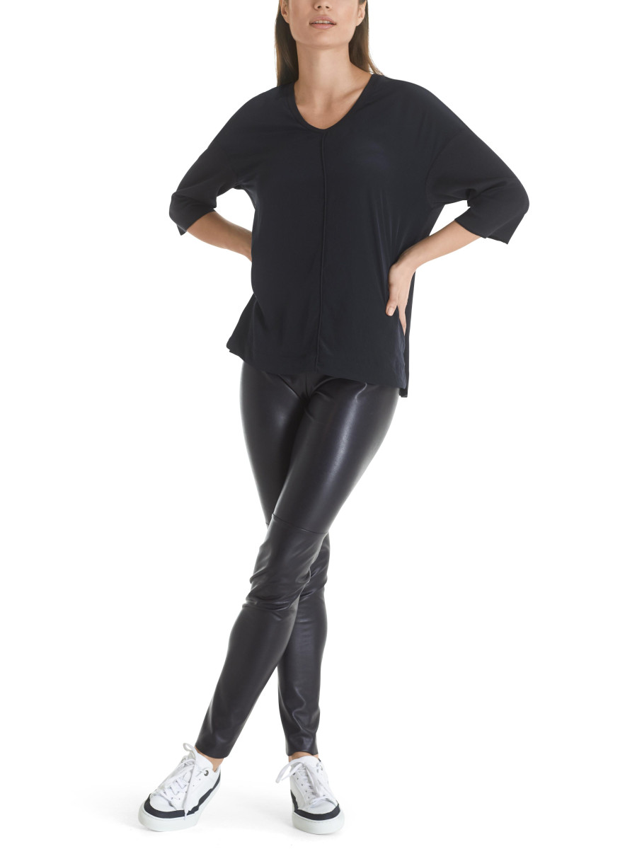 Stilvolles Blusenshirt mit entspannter Silhouette, lässig überschnittenen Schultern und halblangen Ärmeln, die sich ganz easy hochkrempeln lassen. Das Blusenshirt präsentiert sich mit einem spannenden Material-Mix: Das leicht verlängerte Rückteil und die Ärmel sind aus komfortablem Baumwoll-Ripp-Jersey gefertigt, das Vorderteil aus sanft schimmernder Mikrofaser-Qualität.|Farbe: black|Entspannt geschnitten|V-Ausschnitt|Das Model ist 179 cm groß und trägt N3/38.|