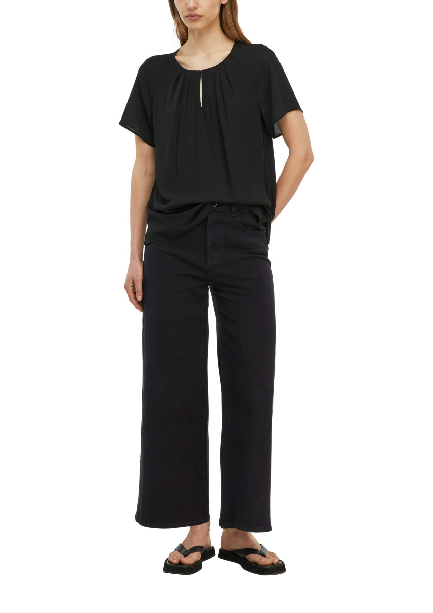 Diese halblange Kurzarm-Bluse aus fließendem Crêpe-Chiffon begeistert mit femininer Eleganz und durchdachten Details. Die dezente Raffung am Ausschnitt setzt reizvolle Akzente, während die Raglanärmel für optimalen Tragekomfort sorgen. Der ausgestellte Saum mit seitlichen Schlitzen verleiht der Bluse eine besonders moderne Silhouette. Sie lässt sich wunderbar zum Business-Look kombinieren oder lässig zur Jeans stylen. Der praktische Schlitz mit Knopf am Crew Neck rundet das Design perfekt ab. Vielseitig tragbar für jeden Anlass.Lief.-Art-Nr: 2175767