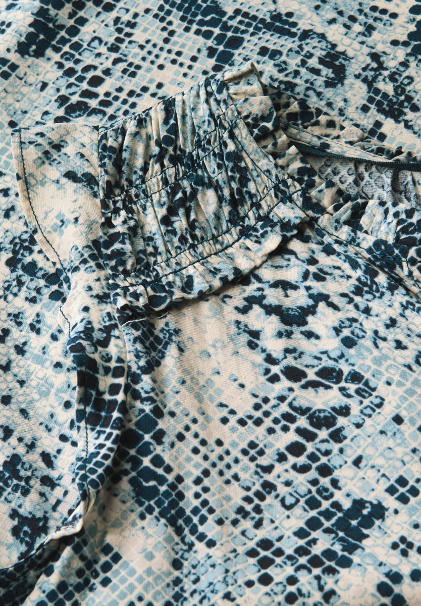 Das ärmellose Blusentop von Street One für Damen bringt mit seinem grafischen Muster und den Rüschen-Details frischen Wind in deinen Sommerlook. Split Neck und Bindebänder runden das Design feminin ab, während die leichte Viskose für ein angenehmes Tragegefühl sorgt. Perfekt für luftige Outfits mit verspieltem Flair. Ärmellose Tunika Split Neck mit Rüschen und Bändern Rüschendetails am Armansatz Grafisches Muster Weiche Viskose Material: 100% Viskose