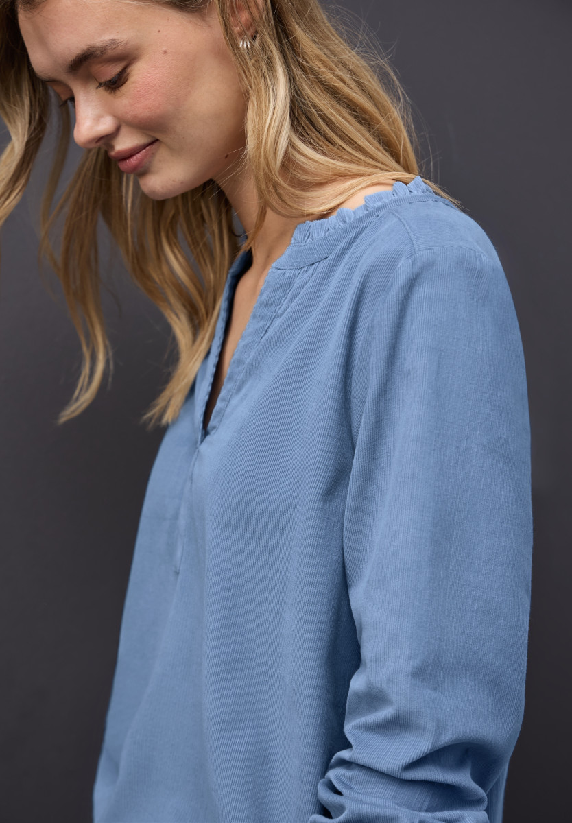 Die Cordbluse von Street One für Damen setzt mit feinen Rüschen-Details feminine Akzente. Der Split Neck, die langen Ärmel mit Bündchen und die hochwertige Cordqualität sorgen für einen modischen Look mit gemütlichem Komfortfaktor. Ideal für jeden Tag. Tunika Rüschendetails Softe Cord-Qualität Split Neck Langarm mit Bündchen Material: 100% Baumwolle