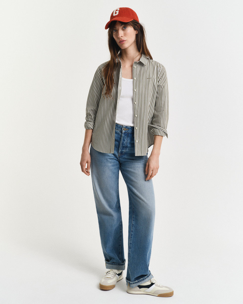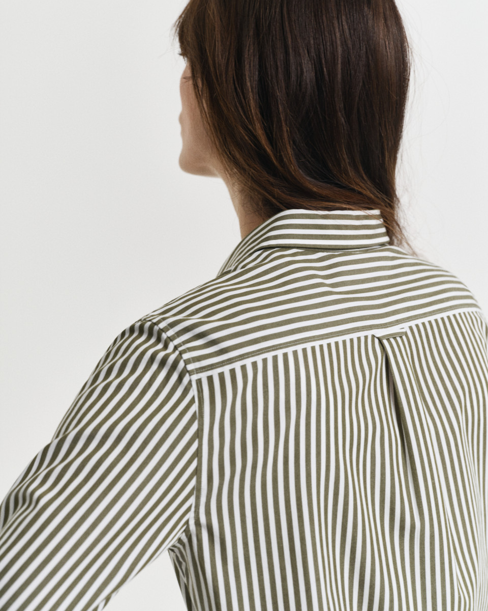 Unsere GANT Regular Fit Bluse für Damen aus makelloser Baumwollpopeline mit garngefärbten Streifen ist perfekt für legere Looks. Zum Design gehören ein spitzer Kragen, ein abgerundeter Saum, eine Logostickerei auf der Brust und unsere charakteristische Kellerfalte mit Locker-Loop-Schlaufe am Rücken.