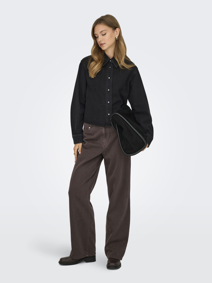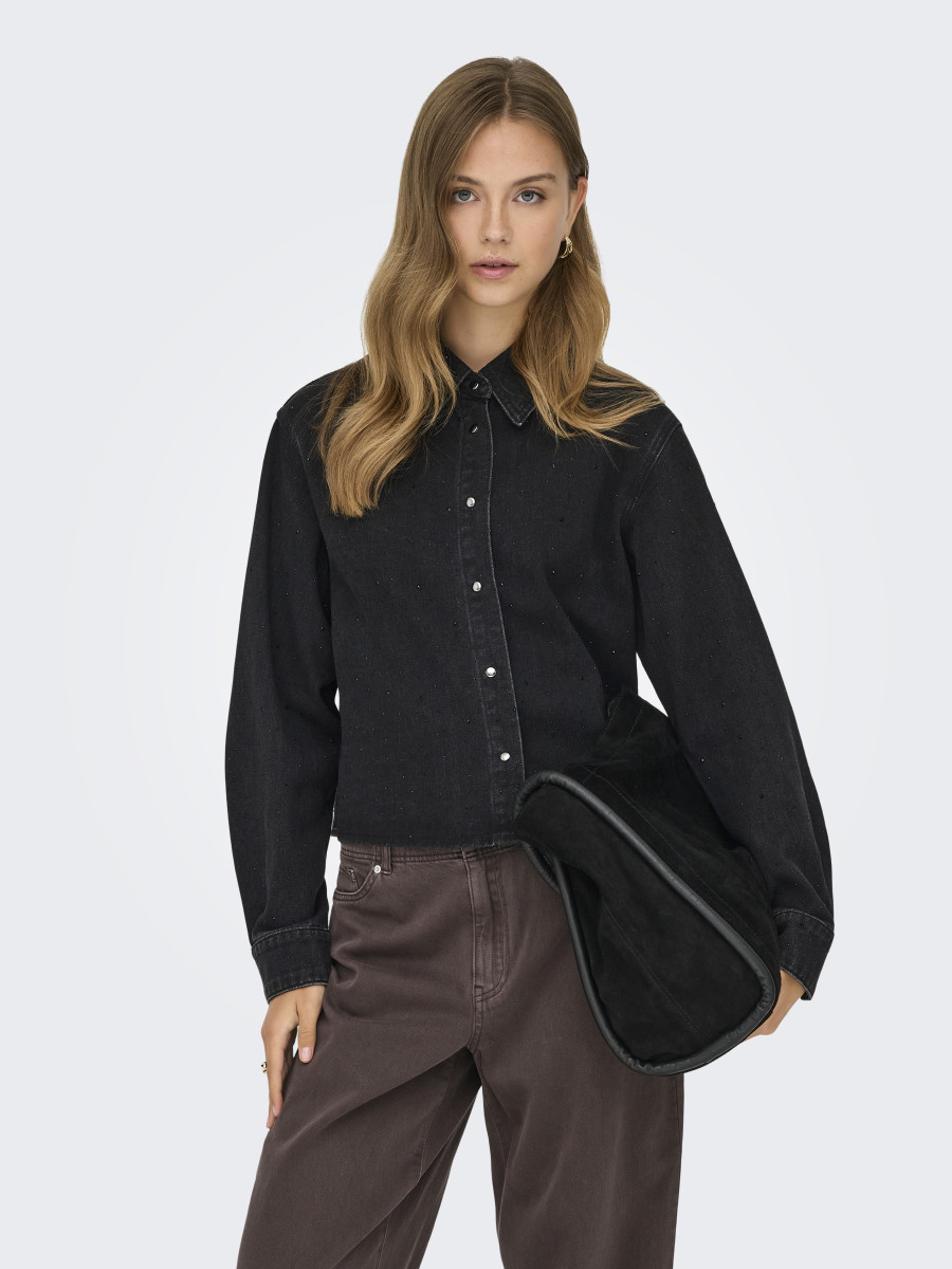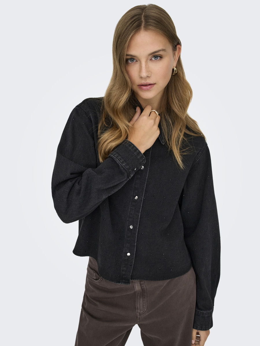 Hemdkragen | Langarm | Knopfleiste | Verkürzt | Ärmelbündchen mit Knopf | Viskose-Mix | Strasssteine