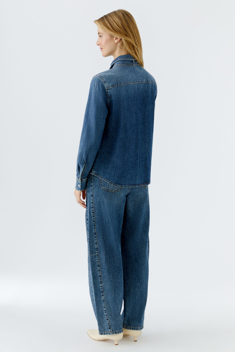Elastischer Baumwolldenim, authentische Dark Blue Denim Waschung Gerade geschnitten, reguläre Länge Mit Kragen und durchgehender Druckknopfleiste Langarm mit Manschette und Knopfverschluss Gerundete Saumlinie | Länge bei Größe 36: 66cm