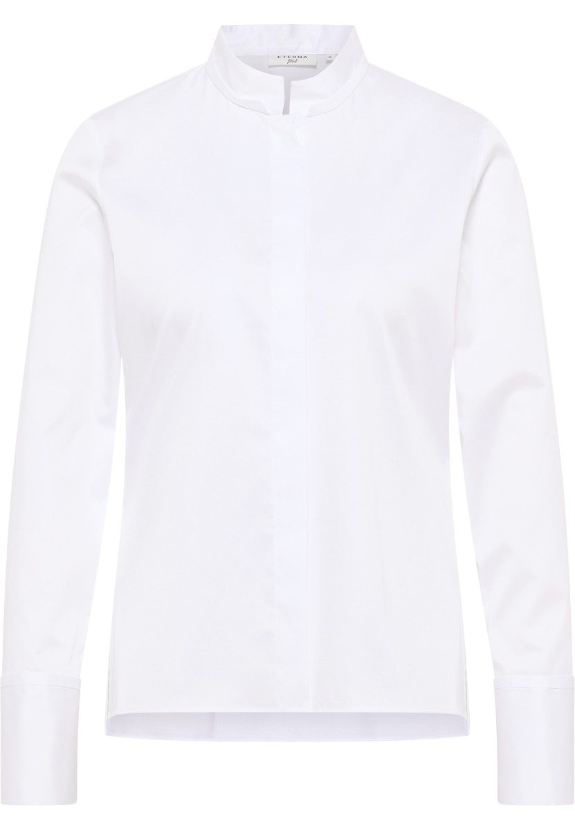 Dieses unifarbene SATIN SHIRT von ETERNA ist geschmeidig und fein schimmernd, es ist ein elegantes Must-have für feminine Businesslooks und stilvolle Momente. Der dezente Glanz des bügelleichten Satingewebes (95% Baumwolle, 5% Elasthan) wirkt edel und macht diese Bluse (Rückenlänge 63 cm) zu etwas ganz Besonderem. Der Stehkragen und die verdeckte Knopfleiste runden den Look dieser Fitted Bluse geschmackvoll ab. Durch die Paspelierungen wird die Kontur des Stehkragens und der Manschetten besonders betont. Die Bluse zaubert eine super-schlanke Silhouette, die durch Abnäher im Rückenteil erreicht wird und die Ihre Figur deutlich akzentuieren. Dank des Stretch-Anteils garantiert dieses Modell jedoch optimale Bewegungsfreiheit. Bestellen Sie dieses einmalige SATIN SHIRT noch heute bequem in unserem Online-Shop!