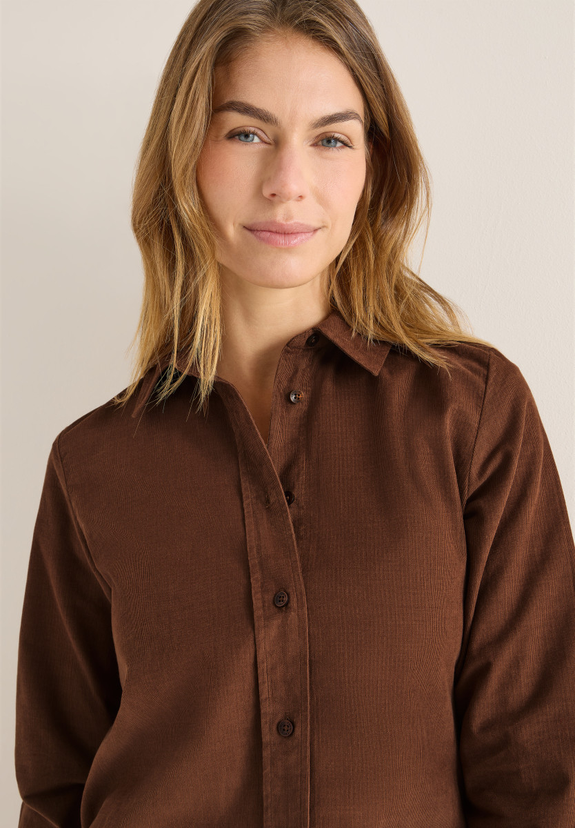 Die Cordbluse von CECIL für Damen ist aus reiner Baumwolle gefertigt und punktet mit ihrem weichen Cordstoff. Hemdkragen und langärmeliger Schnitt mit Knopf-Bündchen machen sie zum vielseitigen Kombiteil. Ideal für strukturstarke Casual-Looks. Damenbluse Hemdkragen Langarm mit Bündchen und Knopf Reine Baumwolle Weicher Cordstoff