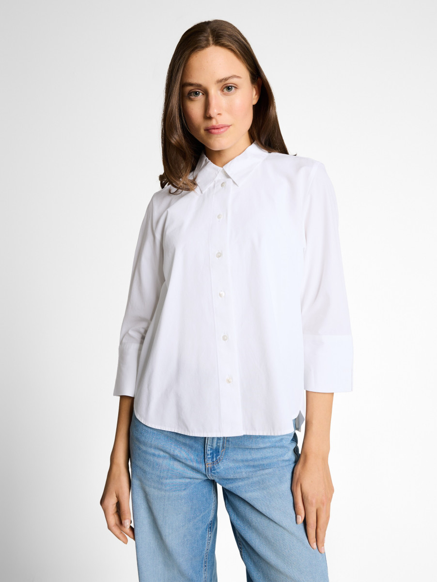 Die Hemdbluse überzeugt mit einer klassischen Silhouette, Kragen und durchgehender Knopfleiste. 3/4-Ärmel sorgen für eine feminine Optik und vielseitige Kombinationsmöglichkeiten. Der gewebte Popeline-Stoff verleiht der Bluse eine glatte Oberfläche und angenehme Haptik.Lief.-Art-Nr: 1049805