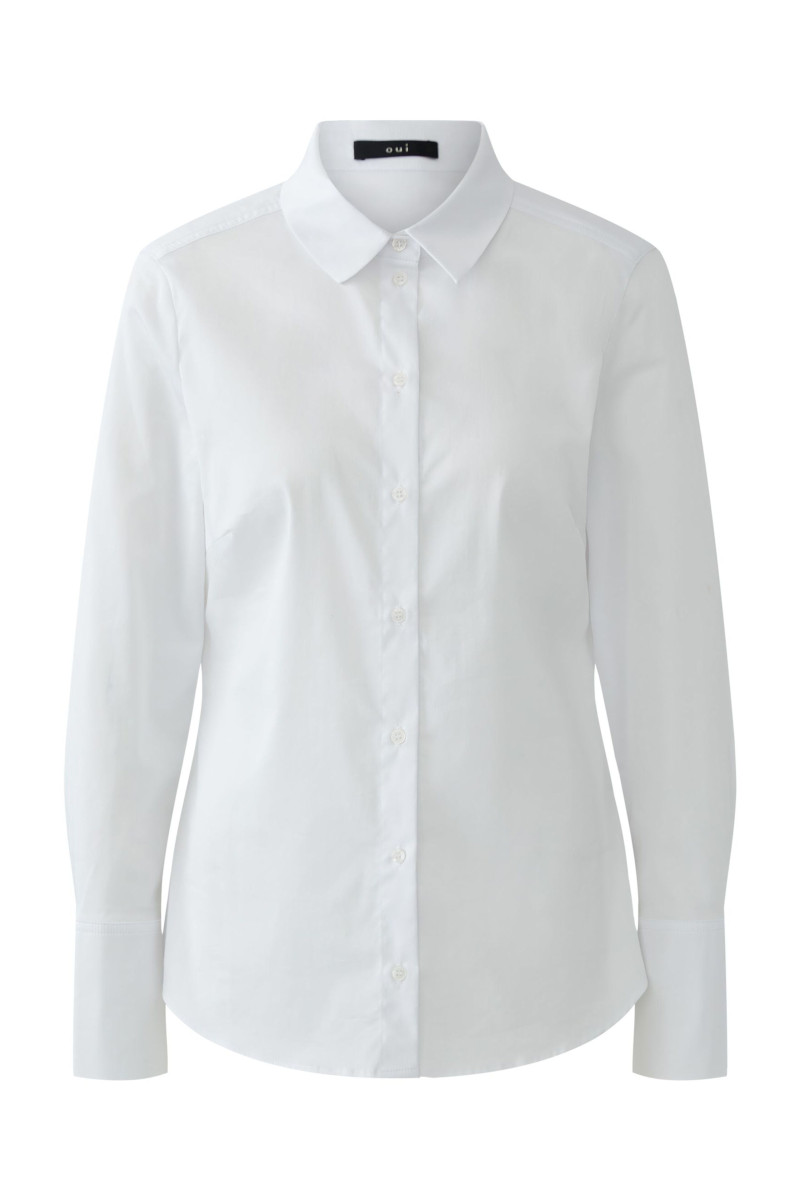 Elastische Baumwollmischung mit leicht satiniertem Glanz Tailliert geschnitten, in regulärer Länge Klassischer Hemdblusenkragen mit durchgehender Knopfleiste, Knöpfe mit tonalem Oui Logo Langer Arm mit Manschette, etwas länger, kann auch umgeschlagen werden Passe am Rücken mit Abnäher zur Taillierung