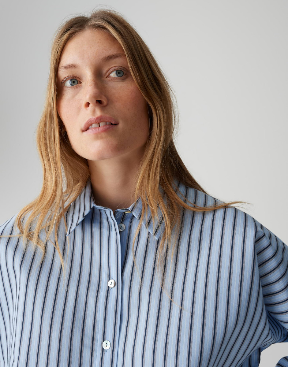 Lockere Passform | Gerader Schnitt | Leicht verkürzt geschnitten | Langer Fledermausärmel | Hemdblusenkragen | Webware | Streifenmuster | Knopfleiste | Kleine Schlitze in den Seiten | Perlmuttknöpfe