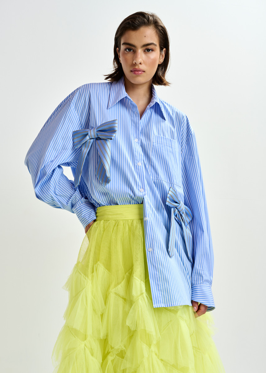 Ein besonderes Highlight sind die zwei applizierten Schleifen auf der Vorderseite, die aus Krawattenbändern gefertigt wurden und dem Hemd eine feminine, einzigartige Note verleihen. Der Schnitt ist weit gefasst mit überschnittenen Schultern und einem leicht abgerundeten Saum, was für eine entspannte Silhouette sorgt.