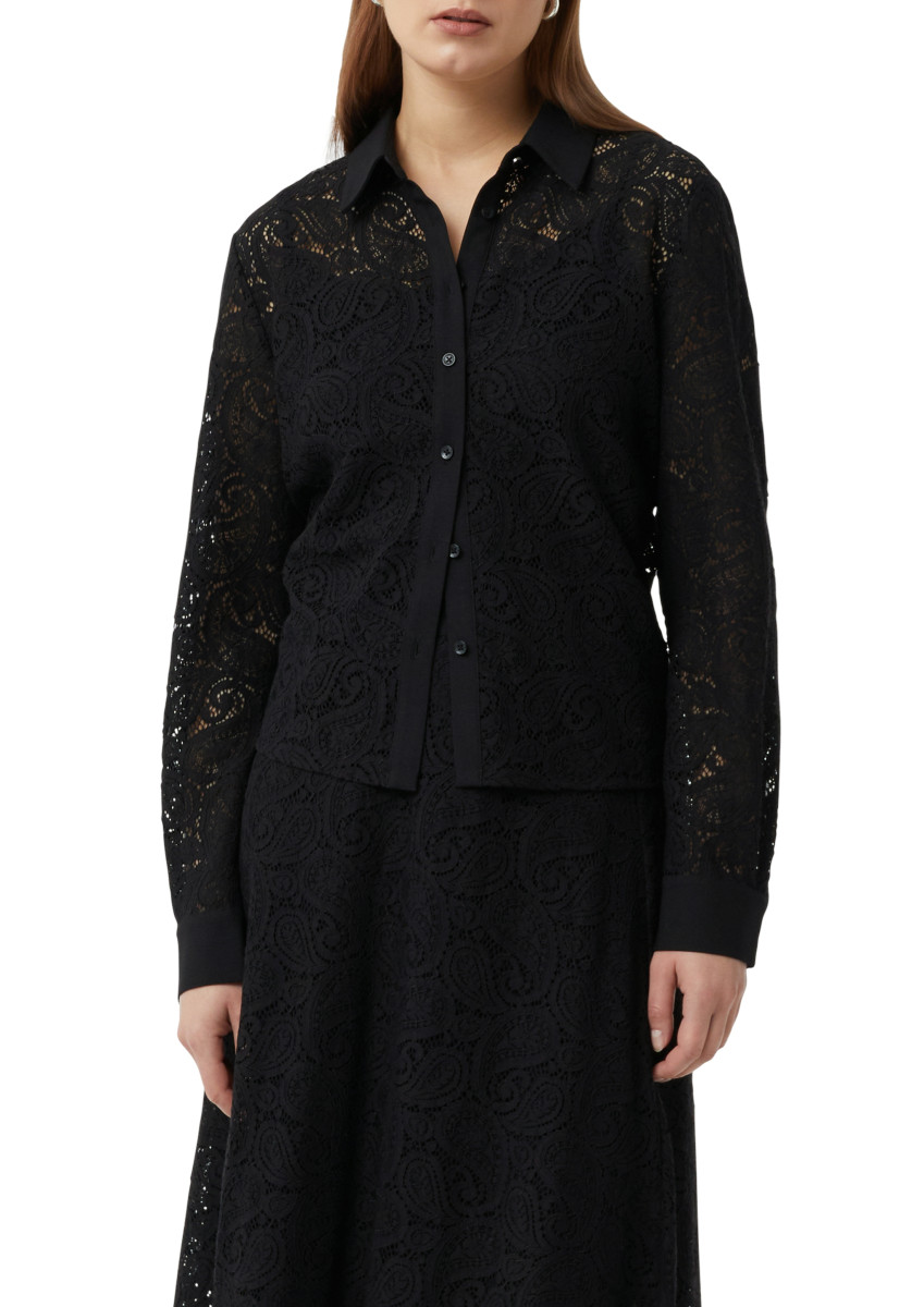 Diese semitransparente Hemdbluse aus hochwertiger Spitze ist ein elegantes Statement-Piece für festliche Anlässe. Der klassische Hemdkragen und die durchgehende Knopfleiste verleihen dem femininen Design eine moderne Note, während die boxy Passform eine lässige Silhouette kreiert. Das gemusterte Spitzengewebe sorgt für einen raffinierten Look, der sich vielseitig stylen lässt. Kombinieren Sie die Bluse zu einer eleganten Bundfaltenhose für einen edlen Auftritt oder tragen Sie sie über einem Camisole zur Highwaist-Jeans für einen entspannten Abendlook.