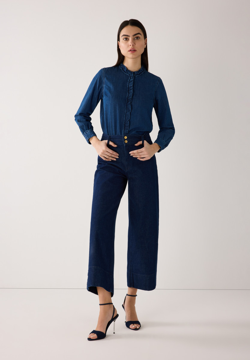 Die moderne Jeansbluse von MORE & MORE mit Rüschenkante und Rüschenkragen sieht besonders cool im Komplett-Look mit einer lässigen Five-Pocket Jeans aus, sie funktioniert aber auch zum fließenden Meshrock oder zur klassischen Businesshose.