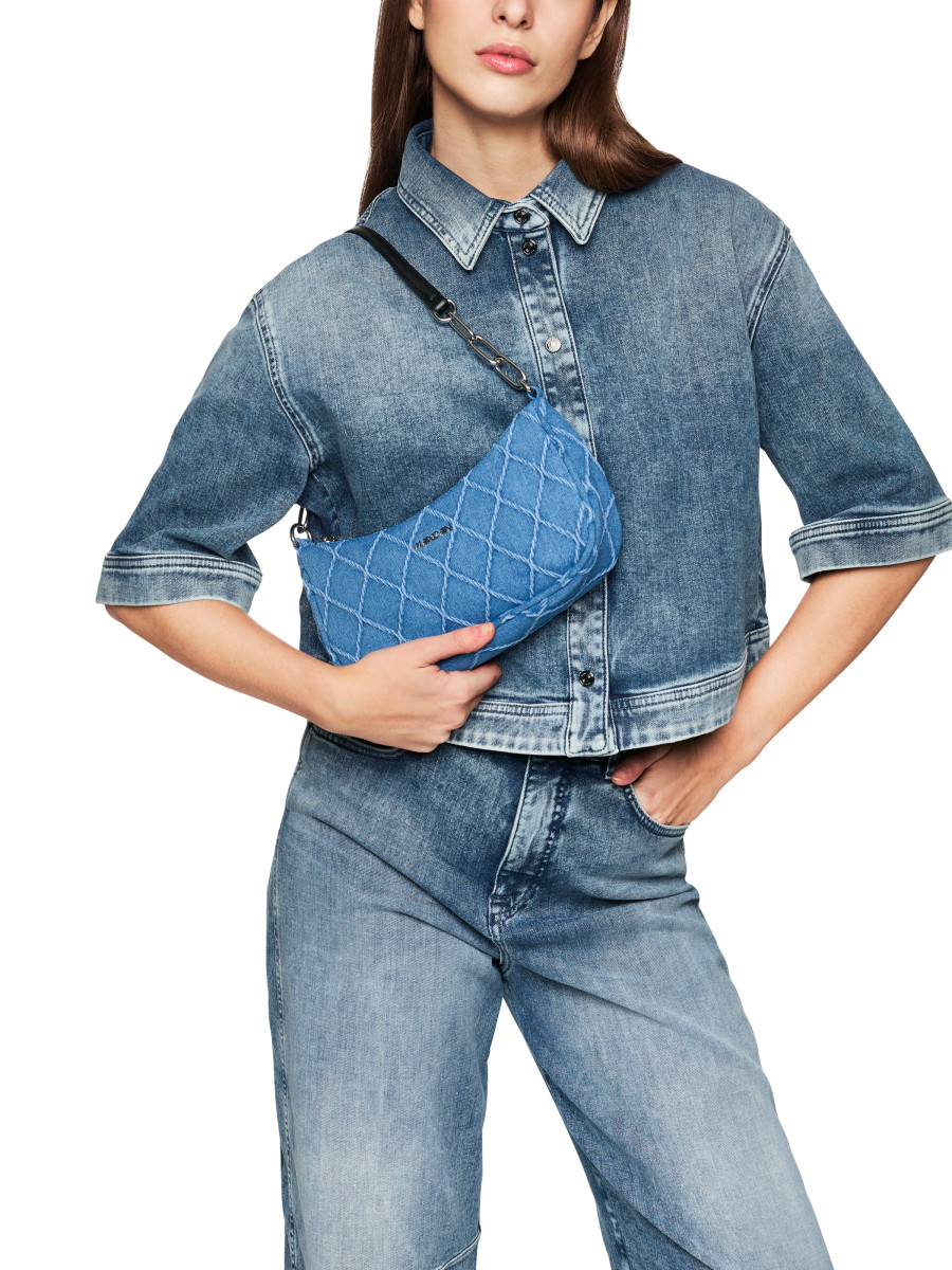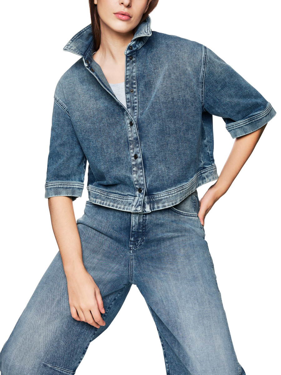 Jeansbluse "Rethink Together" | Die ausgefallene Jeansbluse ist weit und kurz geschnitten. Die Ärmel sind halblang und haben ebenfalls eine weite Form. Durch diese Silhouette hat das Modell einen einzigartigen Look. Die durchgängige Druckknopfleiste rundet das Gesamtbild ab. Die Bluse ist aus regenerativer Baumwolle mit kleinem Stretchanteil gefertigt und trägt das Nachhaltigkeitslabel "Rethink Together" | Kurzer, weiter Schnitt | Regenerative Baumwolle | Druckknopfleiste | Halblange Ärmel | Das Model ist 179 cm groß und trägt N3/38.