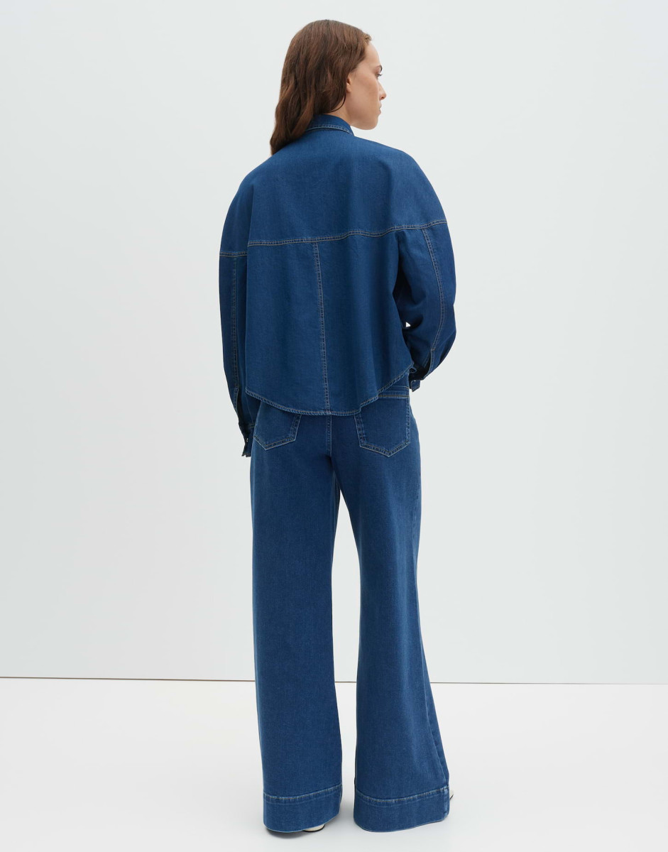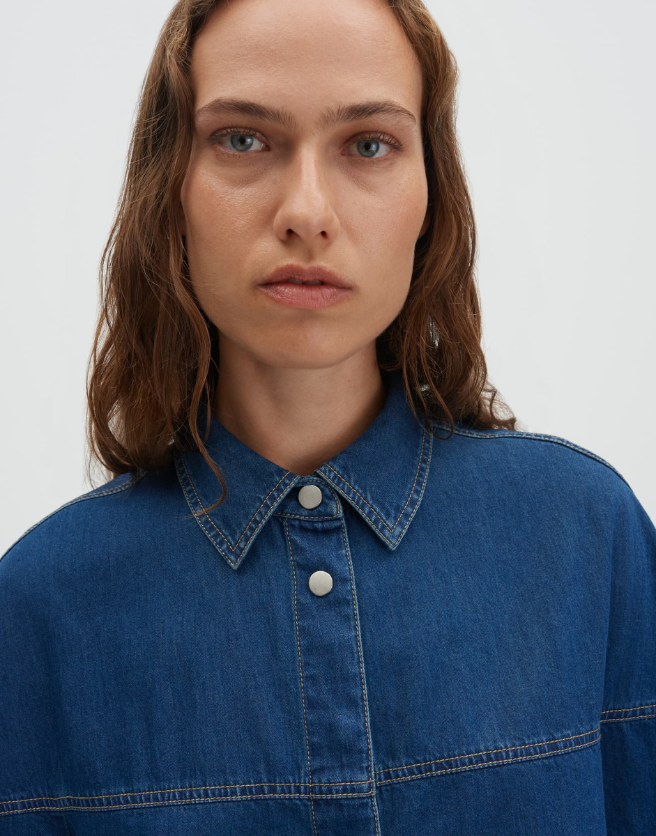 Weite Passform | A-Linie | Langarm | Hemdblusenkragen | Denim | Glatter Griff | Authentische Waschung | Pflegeleicht | Farblich abgesetzte Nähte | Abgerundete Passe | Abgerundeter Saum | Metallische Druckknöpfe
