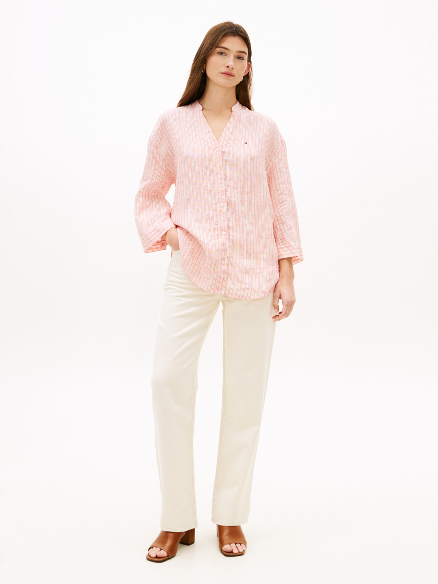 Diese locker geschnittene Bluse mit V-Ausschnitt und kragenloser Silhouette verleiht lässigen Outfits eine edle Note. Rückwärtige Falten, überschnittene Schultern und halblange Ärmel mit Ein-Knopf-Manschetten sorgen für eine entspannte Passform. Die Bluse ist garngefärbt, trägt ein markentypisches Band im Halsausschnitt und besteht aus 100% Leinen.Lief.-Art-Nr: WW0WW48926/ESS LINEN COLLARLESS SHIRT