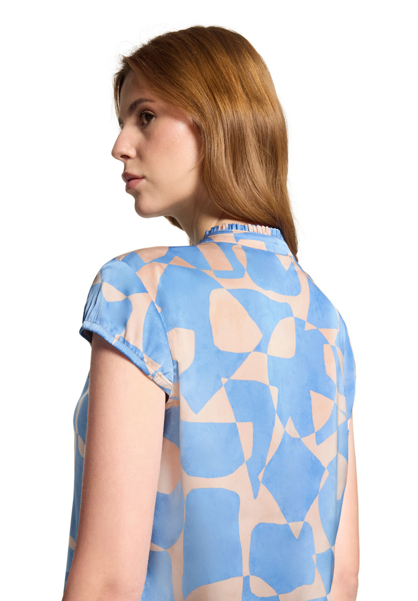 Die Schlupfbluse hat eine figurumspielende Passform und eine Gesamtlänge von 62 cm, wodurch sie sich vielseitig kombinieren lässt. Die halblangen Ärmel sind mit Raffung gearbeitet, und am Ausschnitt sowie am Stehkragen sorgt eine feine Kräuselung für dezente Details. Der Knopfverschluss sorgt für einen klassischen Abschluss, und das unifarbene blau-weiß-Design macht die Bluse zu einem eleganten Basic für Büro und Freizeit.Lief.-Art-Nr: 80003322