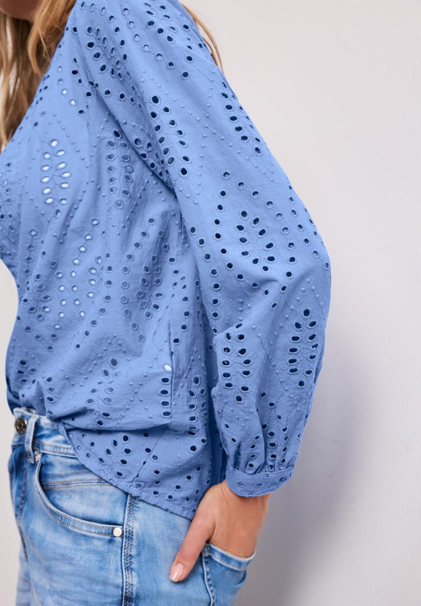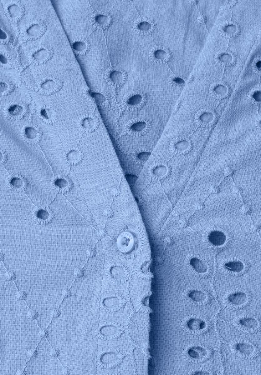 Die Shiffley Tunika von Street One überzeugt mit femininem Design und sommerlicher Leichtigkeit. Reine Baumwolle sorgt für ein angenehmes Tragegefühl, während das feine Lochmuster dem Look eine besondere Note verleiht. Split Neck mit Rüschendetail, Langärmel mit schmalen Bündchen und Knopf sowie die durchgehende Knopfleiste runden die leicht durchscheinende Tunika harmonisch ab.