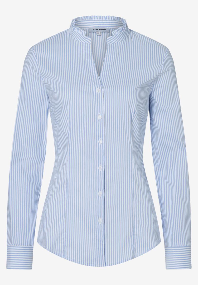 Die feminine Baumwoll/Stretch Bluse in hellblau/weiß gestreift von MORE & MORE mit kleinem Stehkragen und Rüschenkante sieht unter Blazern, Cardigans und Pullovern gleichermaßen gut aus.