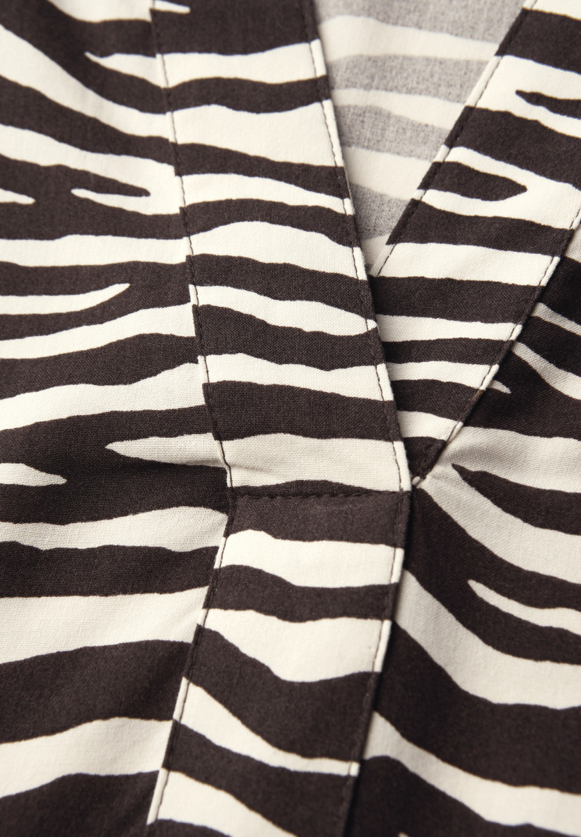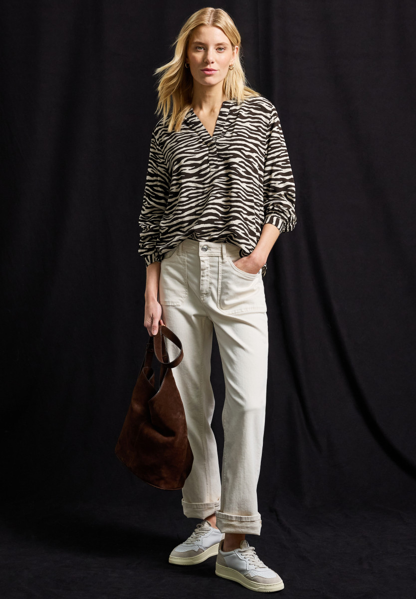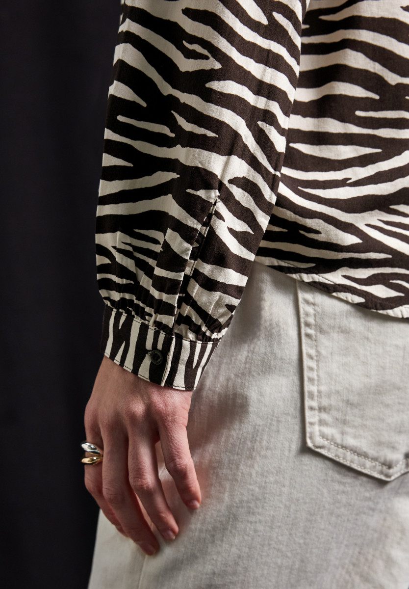 Mit ihrem trendstarken Zebra Print setzt diese Tunika von Street One für Damen ein modisches Statement. Die weiche Viskosequalität und der luftige Schnitt sorgen für angenehmen Tragekomfort. Der Split Neck rundet den Look mit femininer Leichtigkeit ab. Damenbluse Split Neck Langarm Animal Print Weiche Viskose Material: 100% Viskose