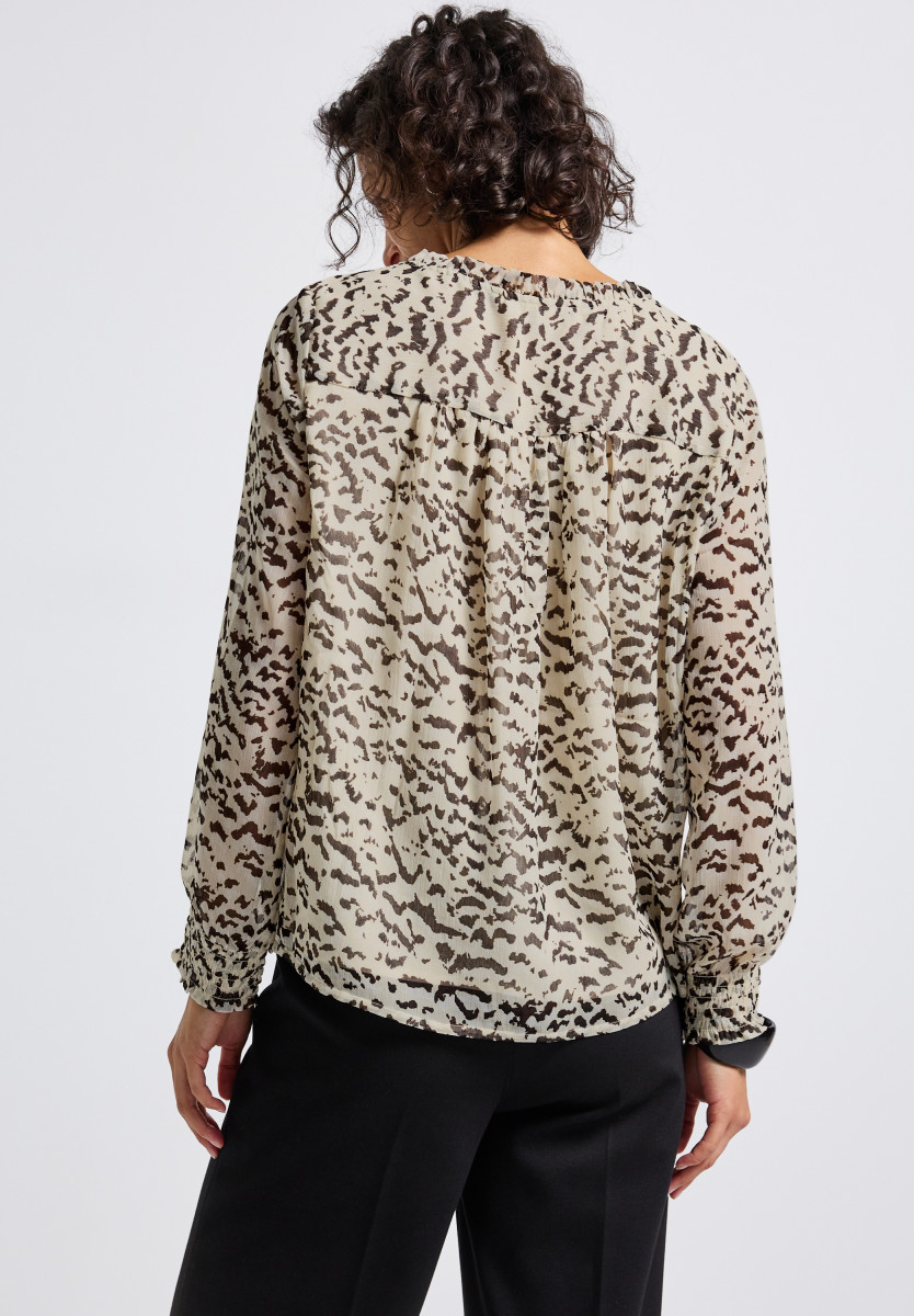 Die Chiffon-Tunika von Street One für Damen überzeugt mit femininer Raffinesse und grafischem Muster. Rüschen am Ausschnitt, ein dezenter Cut-Out und die gesmokten Bündchen an den Ärmeln setzen verspielte Akzente. Die leichte Qualität und die zarte Raffung an den Schultern sorgen für eine fließende Silhouette und angenehmen Tragekomfort. Damenbluse Ausschnitt mit Rüschen und Cut-Out Langarm mit Smok-Bündchen Feminine Raffung an den Schultern Grafisches Muster Material: Obermaterial: 100% Polyester; Futter: 100% Modal