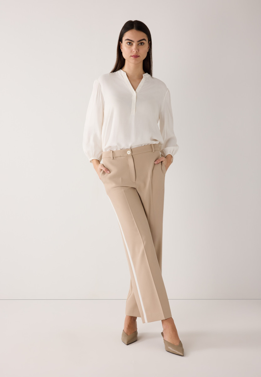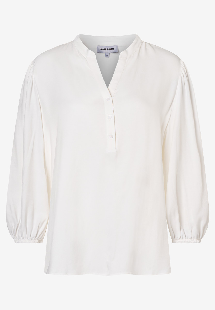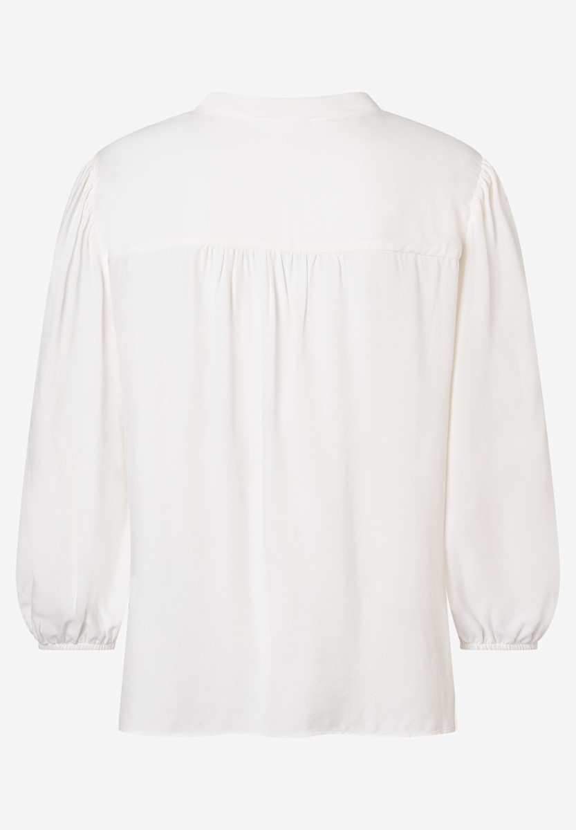 Lockerer Shape | Kleiner V-Ausschnitt und Stehkragen | Kurze Knopfleiste | 3/4 lange, voluminöse Ärmel mit Gummizug am Abschluss | Rückteil mit Passe und Kräuselfalten | Fließende Viskosequalität