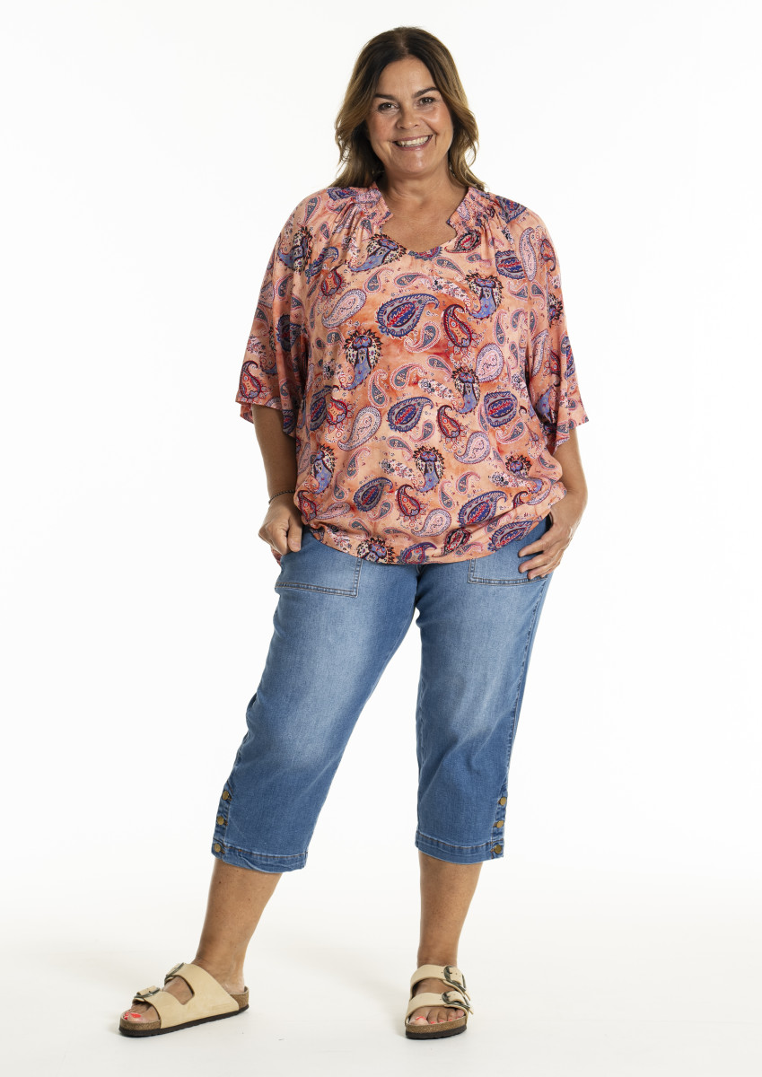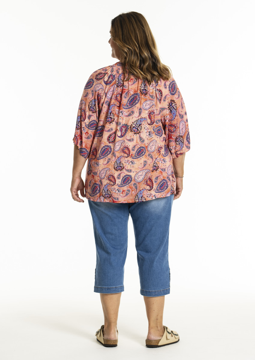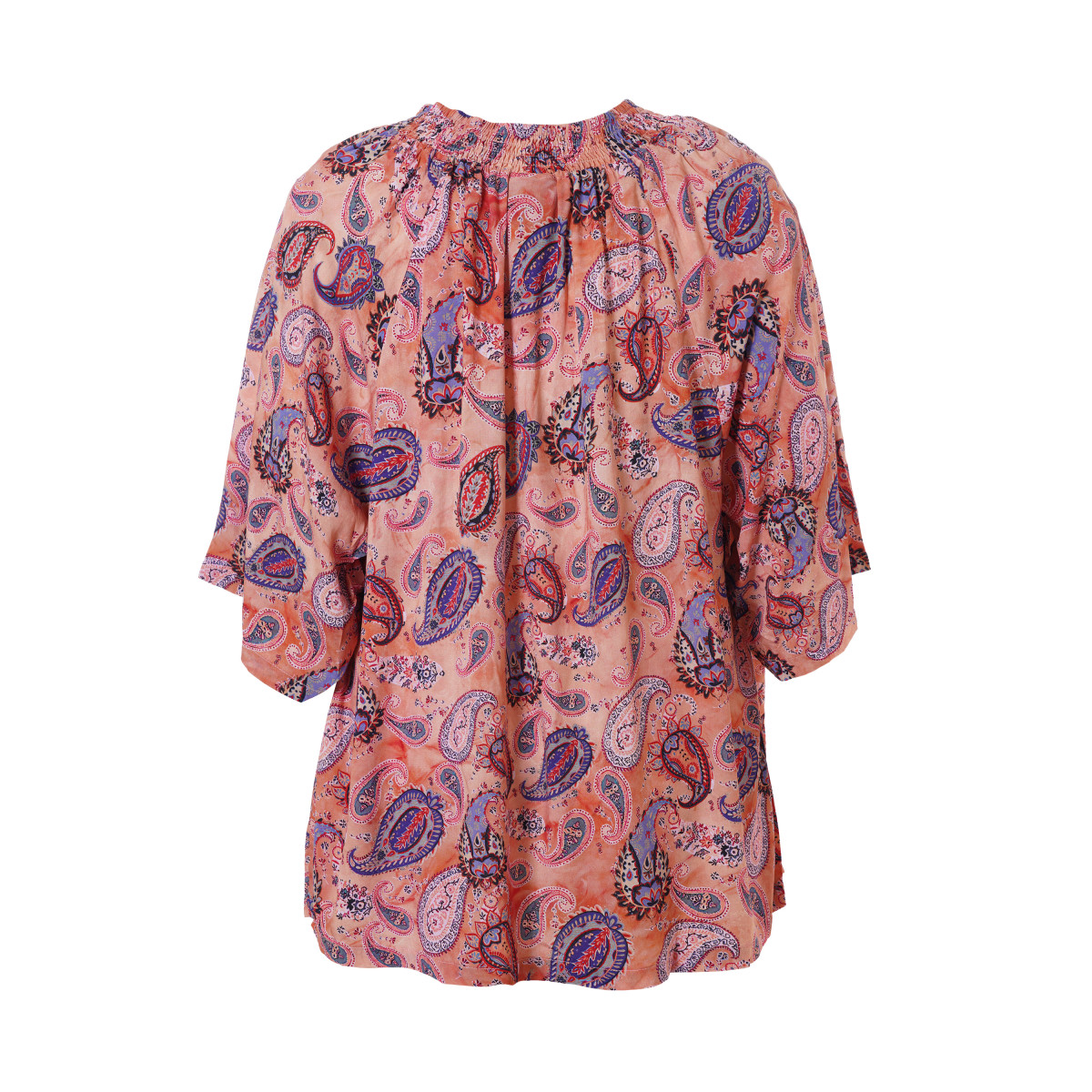 Locker geschnittene Bluse in A-Linie mit grafischem Print in Korall- und Pastelltönen. Mit rundem Ausschnitt, Raglanärmeln und elastischem Einsatz im Nacken – leicht, bequem und ideal für sommerliche Looks.