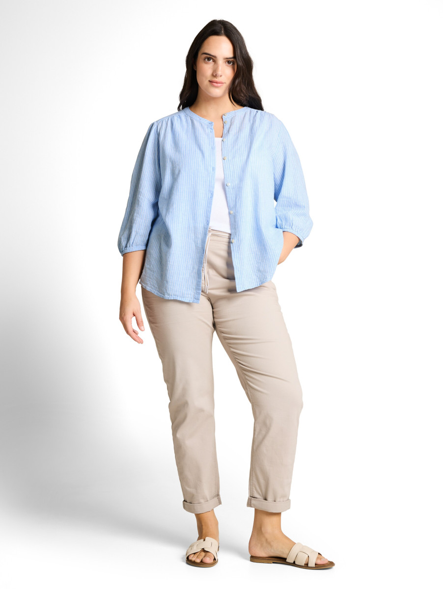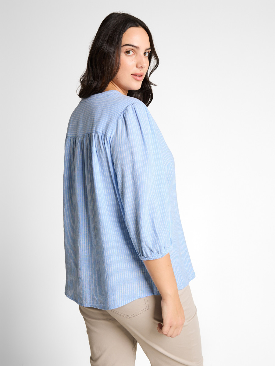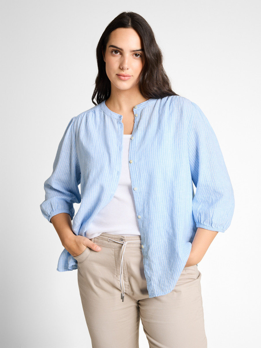 Gestreifte Leinenbluse mit Knopfleiste, 3/4-Arm und Raffungen an den Schultern und der Rückenpasse. Mit einem elastischen Band in den Ärmelabschlüssen für eine geraffte Optik. Leinenanteil eignet sich ideal im Frühling und Sommer für ein leichtes und kühlendes Tragegefühl.Lief.-Art-Nr: 1050904