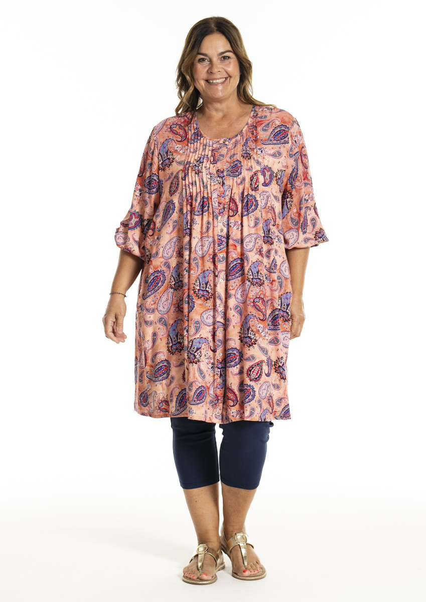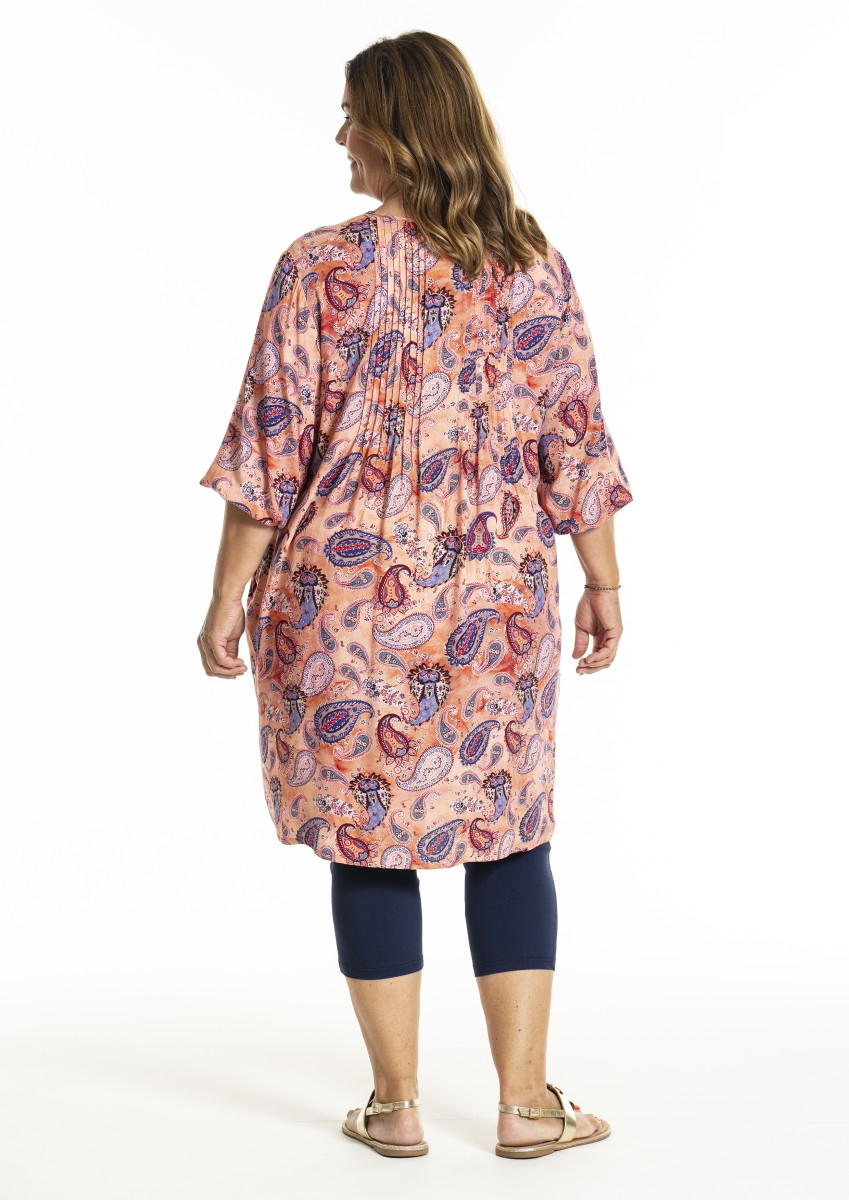 Lockeres Shirt-Tunic in A-Linie aus 100 % Viskose mit Rundhalsausschnitt, durchgehender Knopfleiste und praktischen Seitentaschen. Figurschmeichelnde Biesen vorn und hinten, 3/4-Ärmel mit elastischen Bündchen – bequem, stylisch und ideal für lässige Alltags- oder City-Looks.