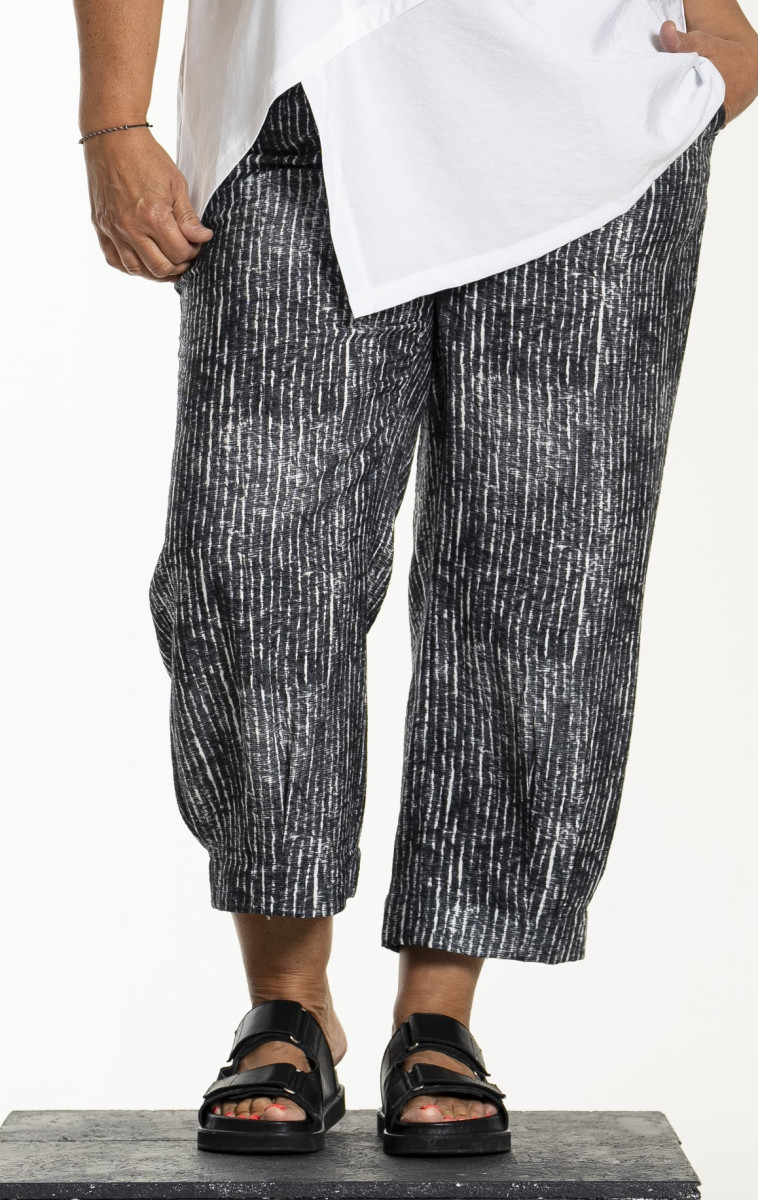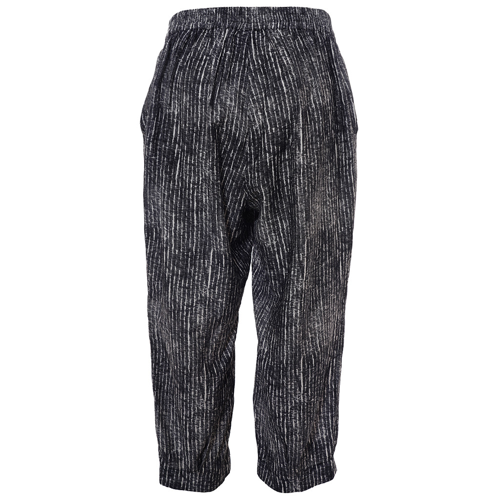 Weite, bedruckte Hose im Viskose-Nylon-Mix mit elastischem Bund, seitlichen Eingrifftaschen und dekorativen Falten am Saum – bequem und stylisch für kreative Casual-Looks.