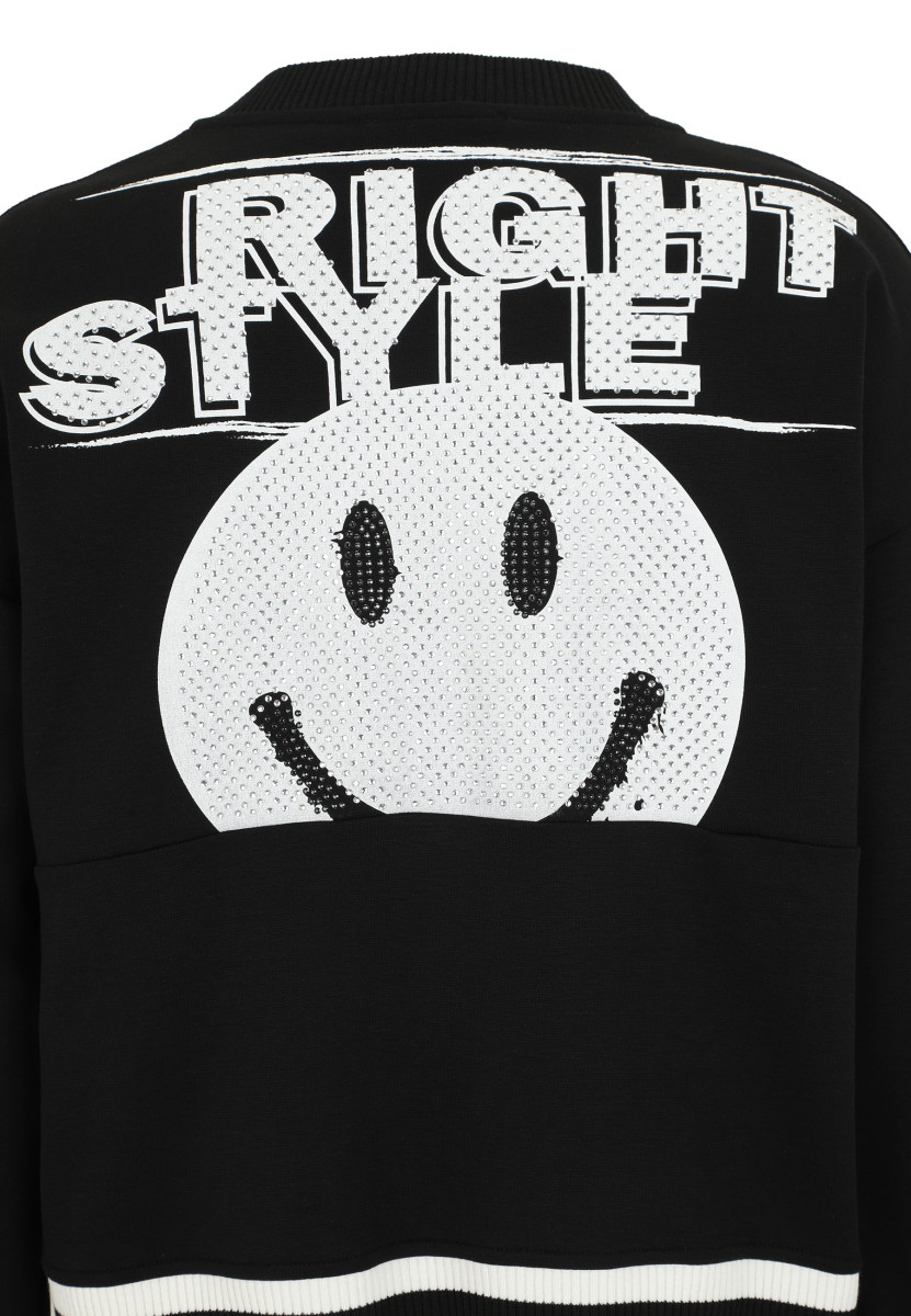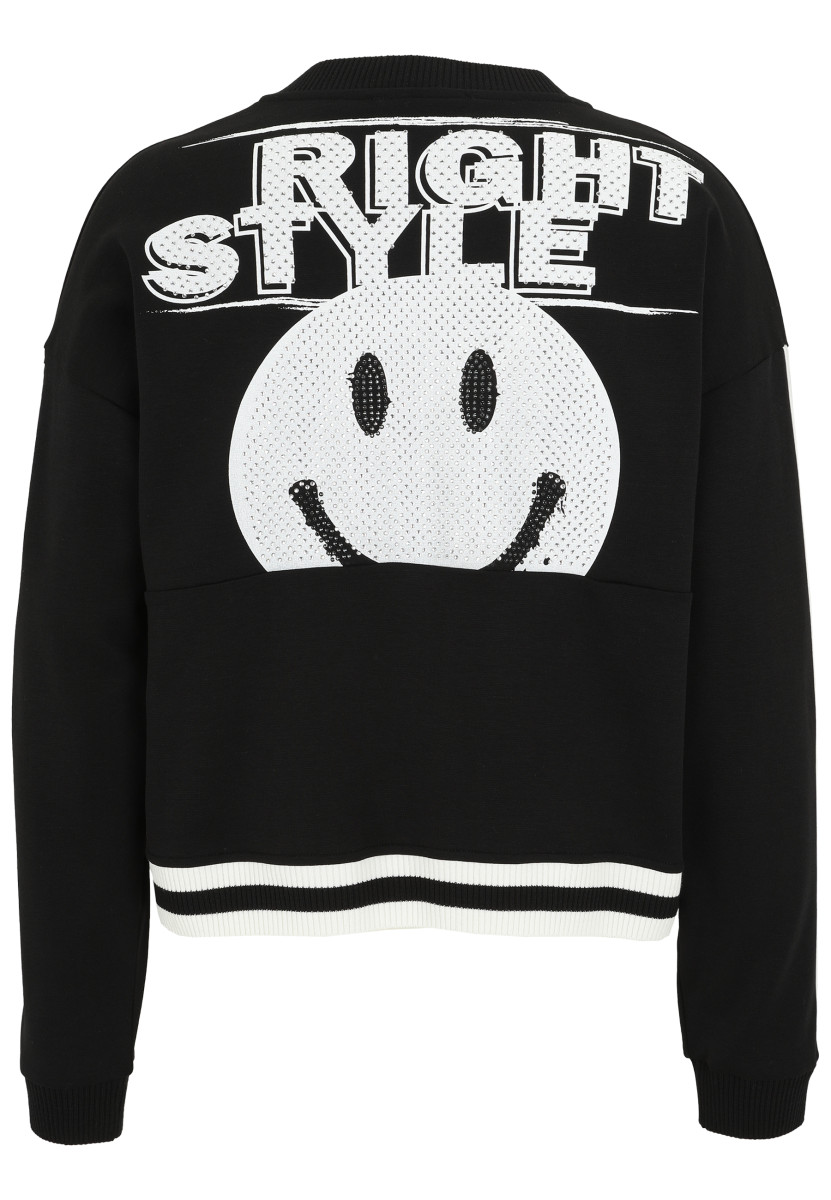 Diese modisch kürzere Bomberjacke von Doris Streich ist aus stretchiger Sweatware gefertigt. Das kleine Motiv auf dem Vorderteil ist ein Mix aus Stick und Druck. Die Jacke wird zum Hingucker durch das große Smiley Druck-Motiv auf dem Rücken mit seinen vielen Strass-Steinchen. Komplettiert wird der modische Look durch ein gestreiftes Ripp-Bündchen.