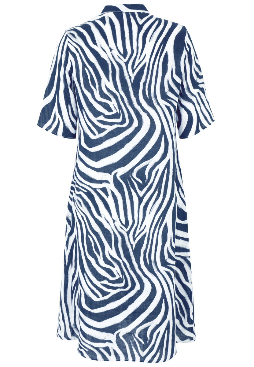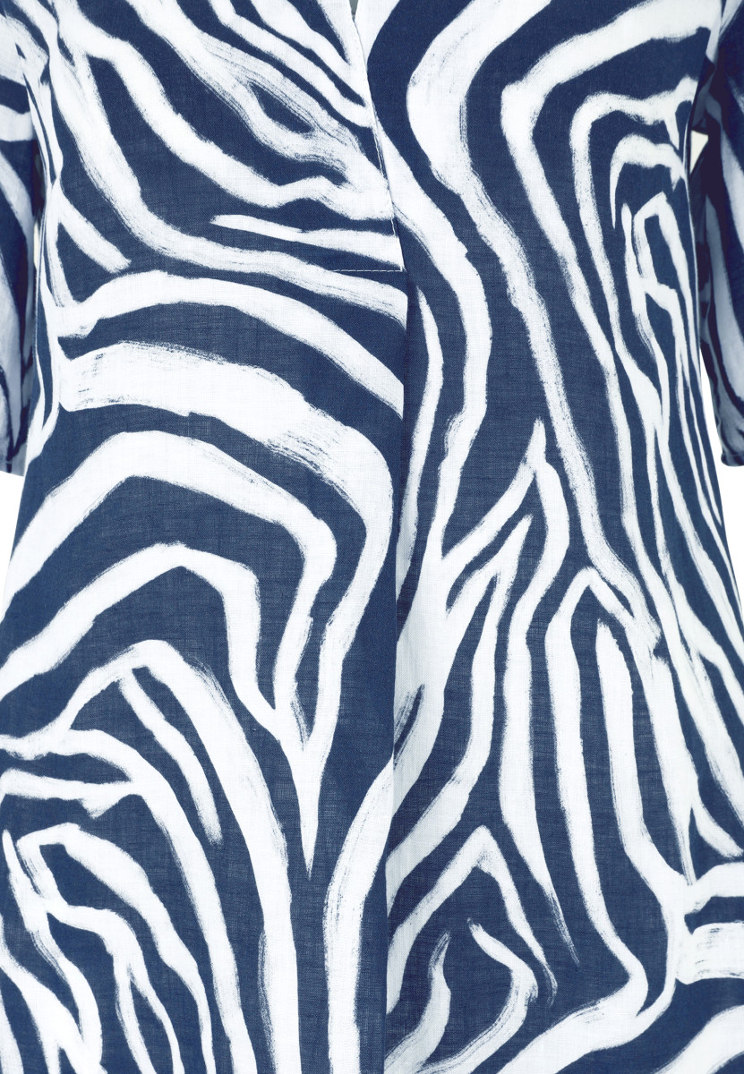 Das feminine kniebedeckende Kleid von Doris Streich mit cleanem marine-weißen Zebramuster-Print ist aus softem Leinen-Gewebe gefertigt. Die lässig ausgestellten 3/4-Ärmel und die tiefe Falte im Vorderteil bieten besten Tragekomfort. Das leichte kühlende Material machen dieses Kleid zum Lieblingsteil für heiße Sommertage. Alloverprint, nicht platziert - jedes Teil ein Unikat.
