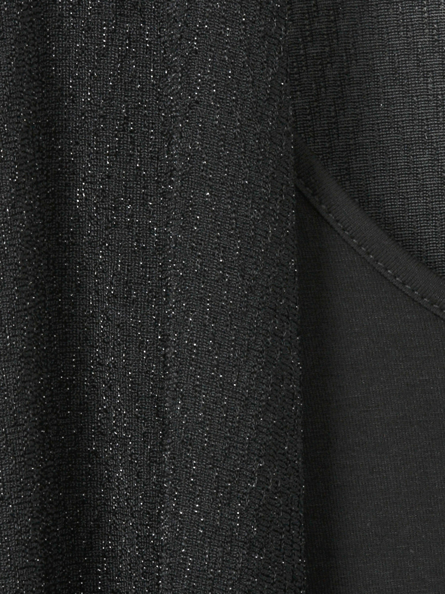 Dieses langärmlige Oberteil vereint die Eleganz einer Bluse mit dem Komfort eines Cardigans und ist ideal für gepflegte Anlässe. Es präsentiert sich in einem weichen, feingestrickten oder gewebten Material, das eine dezente Textur und einen subtilen Glitzer- oder Schimmereffekt aufweist, der bei Lichteinfall edel funkelt.