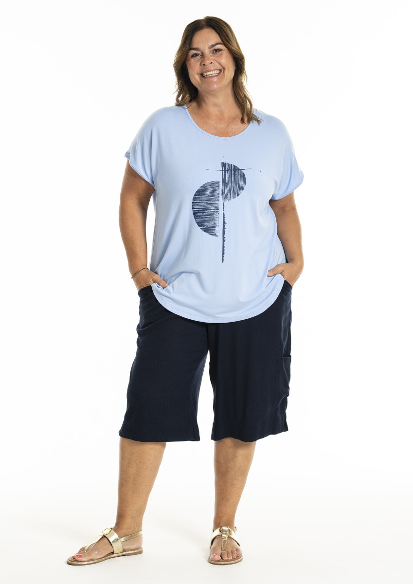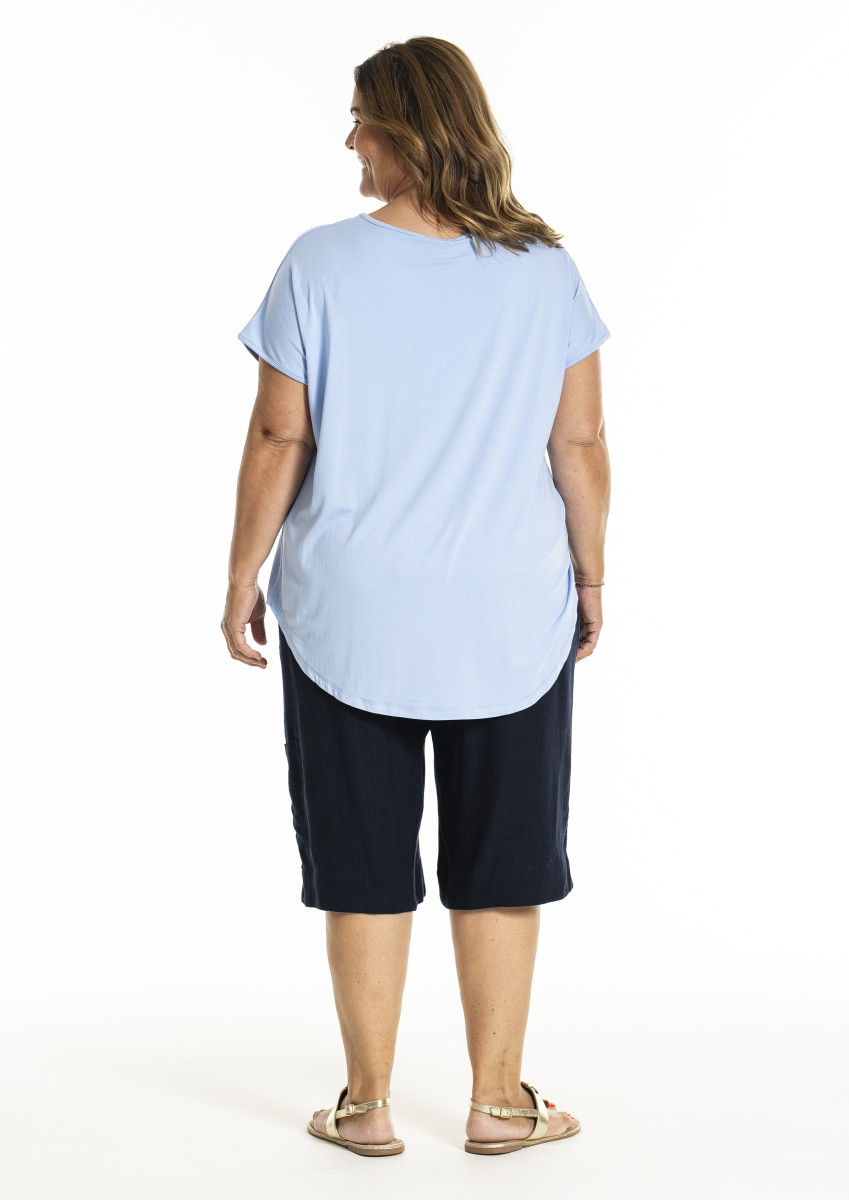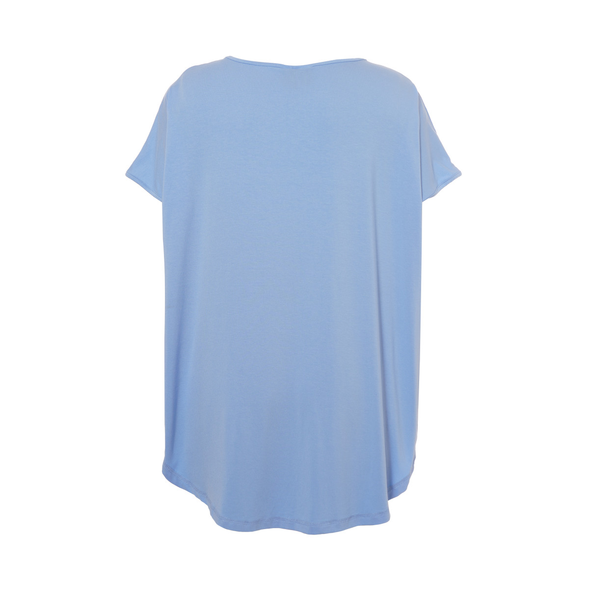 Lockeres T‑Shirt in A‑Form aus elastischem Viskose‑Jersey. Mit Rundhalsausschnitt, kurzen Raglanärmeln und floraler Brust‑Applikation – leichter Saum, hinten minimal länger. Komfortabel, stilvoll, perfekt für entspannte Freizeit‑Looks.