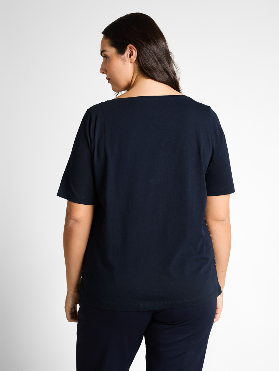 Dieses T-Shirt überzeugt mit einem U-Boot-Ausschnitt und halblangen Ärmeln für einen lässigen Look. Die Vorderseite ist mit einem Streifenmuster und einem dezenten Schriftzug auf der Brust versehen. Aus einem weichen Single-Jersey-Stoff gefertigt, bietet es angenehmen Tragekomfort.Lief.-Art-Nr: 1050879