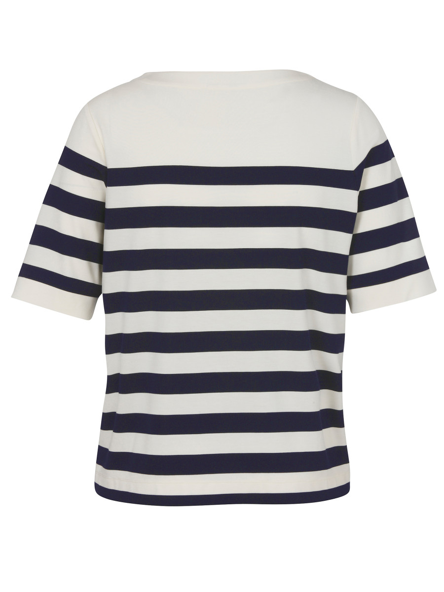 Dieses Damen-T-Shirt verfügt über einen klassischen U-Boot-Ausschnitt und halblange Ärmel, die für eine entspannte Silhouette sorgen. Das gestreifte Design in Ecru und Marine verleiht dem Shirt eine maritime Note und lässt sich vielseitig kombinieren. Die legere Passform macht es zu einem komfortablen Begleiter für Alltag und Freizeit.Lief.-Art-Nr: 2612739